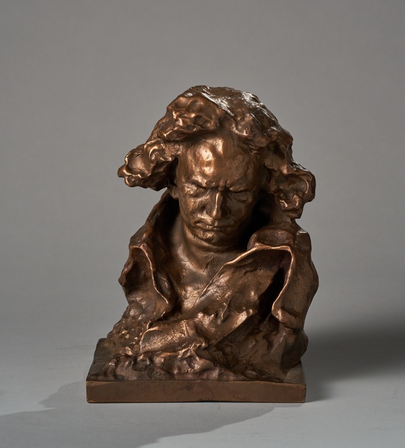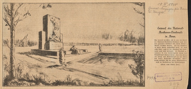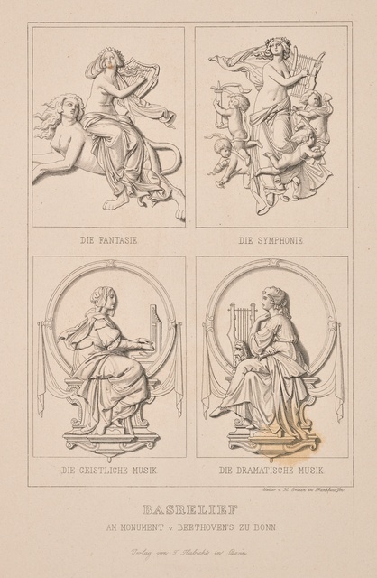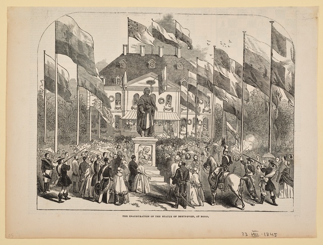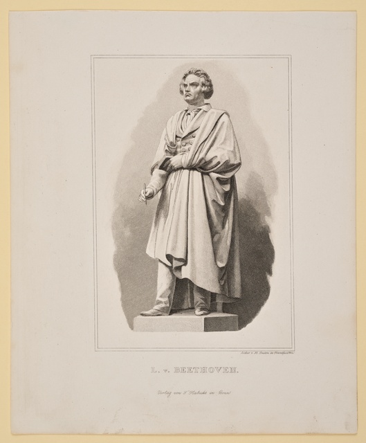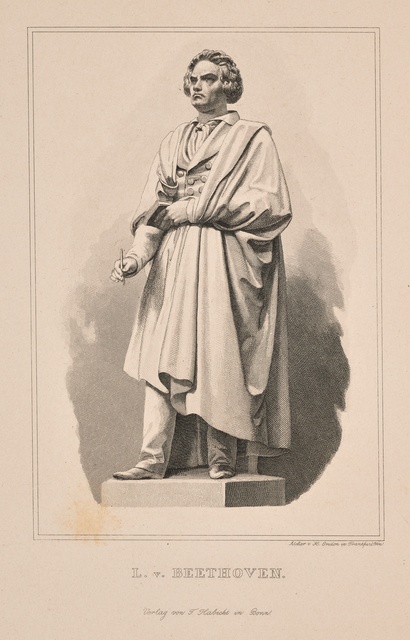 Ludwig van Beethoven, Figur nach dem Denkmal auf dem Münsterplatz in Bonn - Plastik von Ernst Julius Hähnel, 1845, Stich von Hermann Emden, Frankfurt, Druck von Tobias Habicht, Bonn, 1845