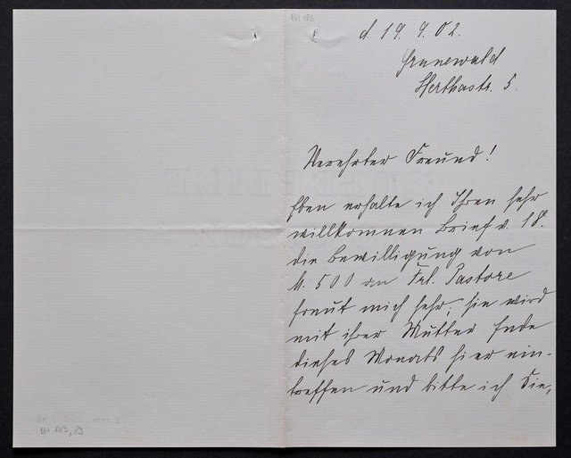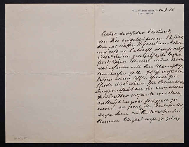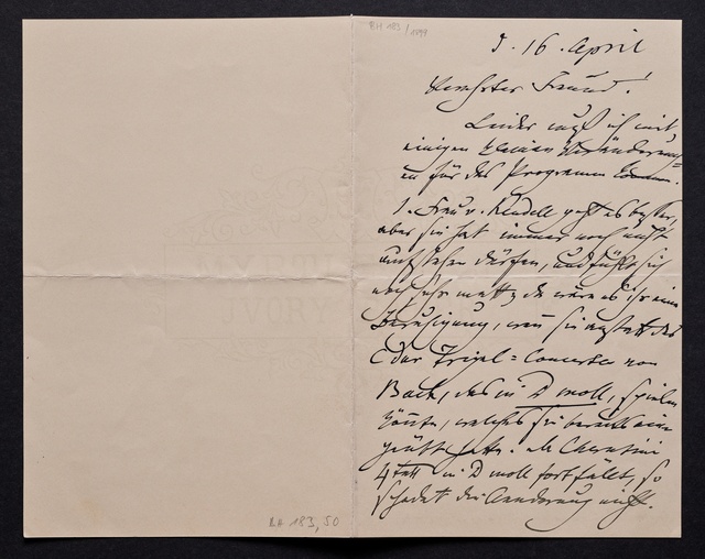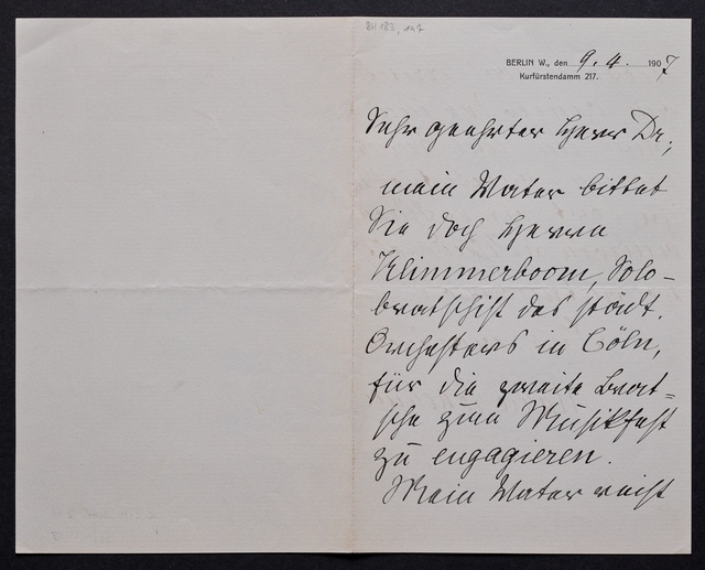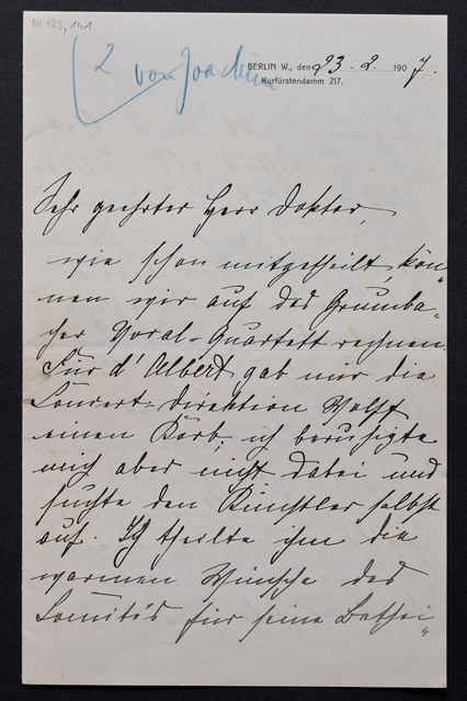 Marie Joachim, Brief an ein Mitglied des Vorstands des Beethoven-Hauses in Bonn, wahrscheinlich Friedrich Knickenberg, Berlin, 9. April 1907, Autograph