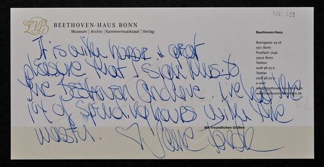 Jane Fonda, Grußkarte an das Beethoven-Haus in Bonn, New York, 19. April 2009, Autograph