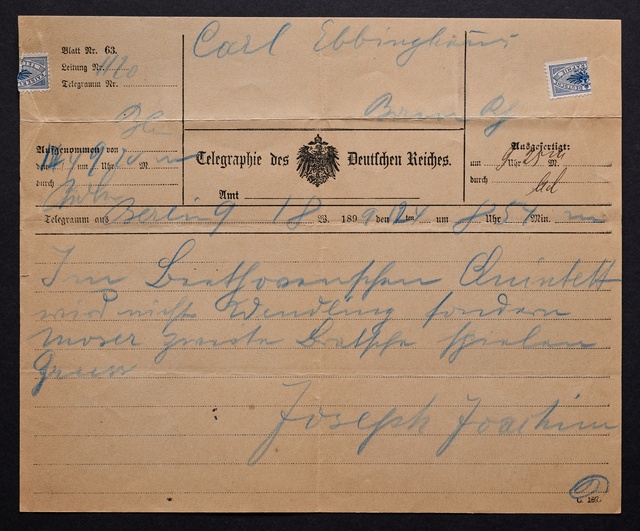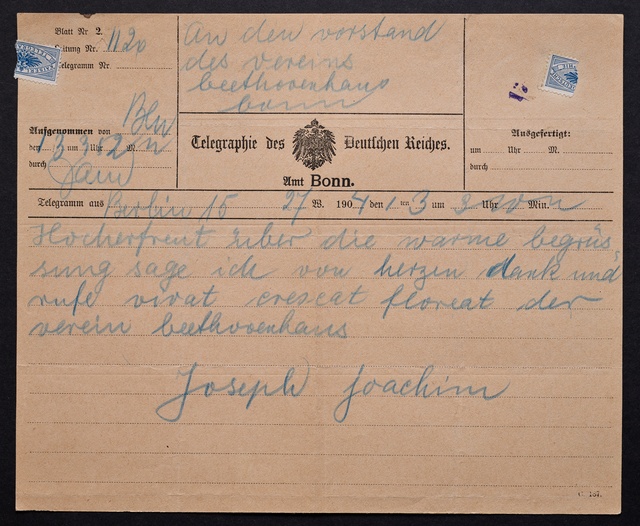 Joseph Joachim, Telegramm an den Vorstand des Vereins Beethoven-Haus in Bonn, Berlin, 1. März 1904