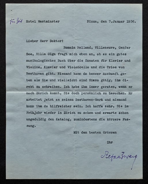Stefan Zweig, Brief an Max Unger, Nizza, 7. Januar 1936, Typoskript