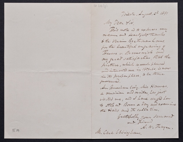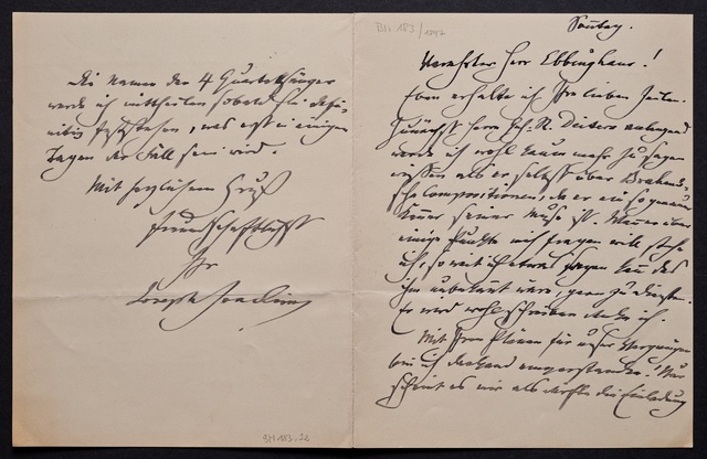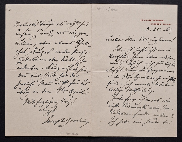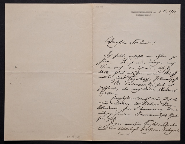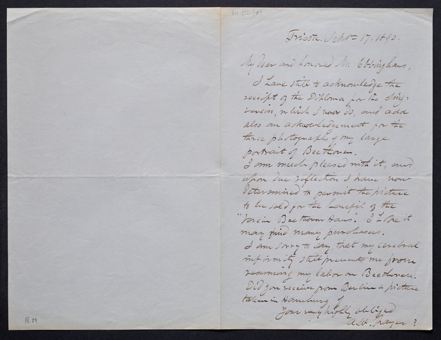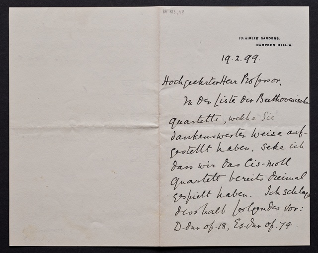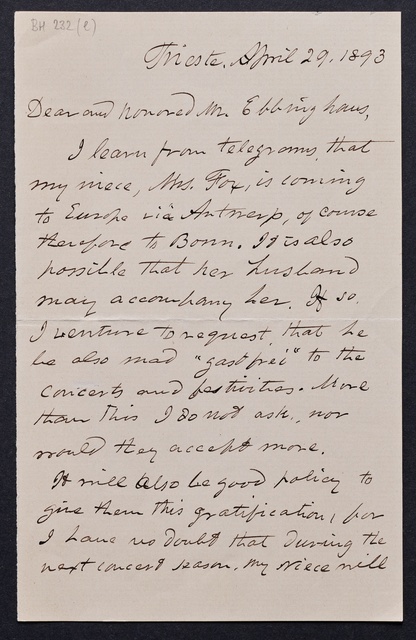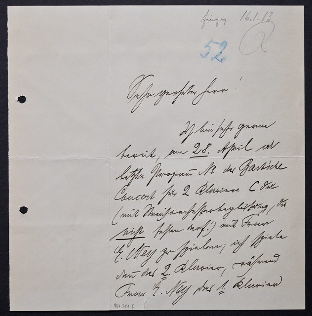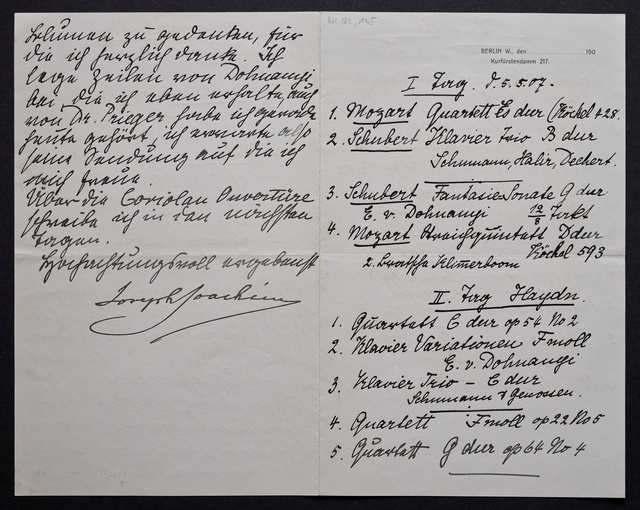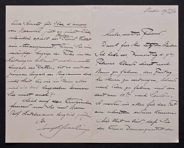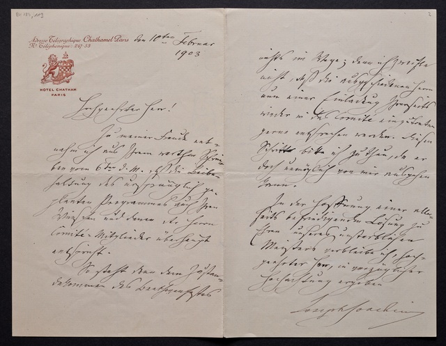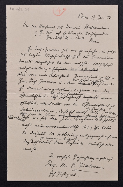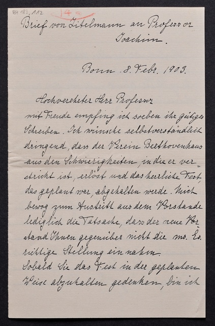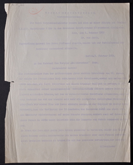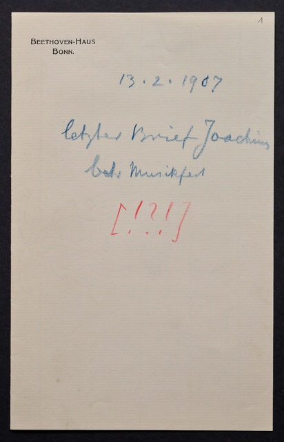 Joseph Joachim, Brief an ein Mitglied des Vorstands des Beethoven-Hauses in Bonn, wahrscheinlich Friedrich Knickenberg, Berlin, 23. Februar 1907, Diktat