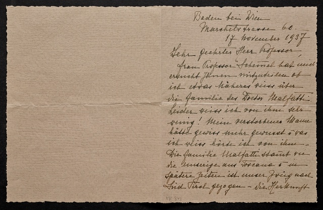 Franziska von Malfatti di Monte Tretto, Brief an Leo Grünstein in Wien, Baden, 17. November 1937, Autograph