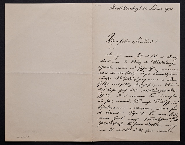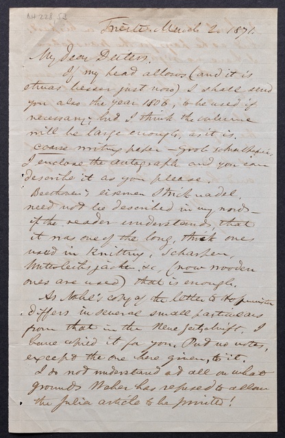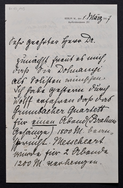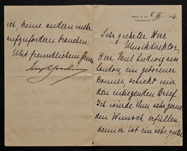 Joseph Joachim, Brief an ein Mitglied des Vorstands des Beethoven-Hauses in Bonn, wahrscheinlich Friedrich Knickenberg, Berlin, 1. März 1907, Diktat