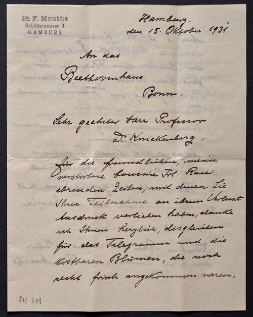 Friedrich Mouths, Brief an den Verein Beethoven-Haus Bonn, Hamburg, 15. Oktober 1931, Autograph