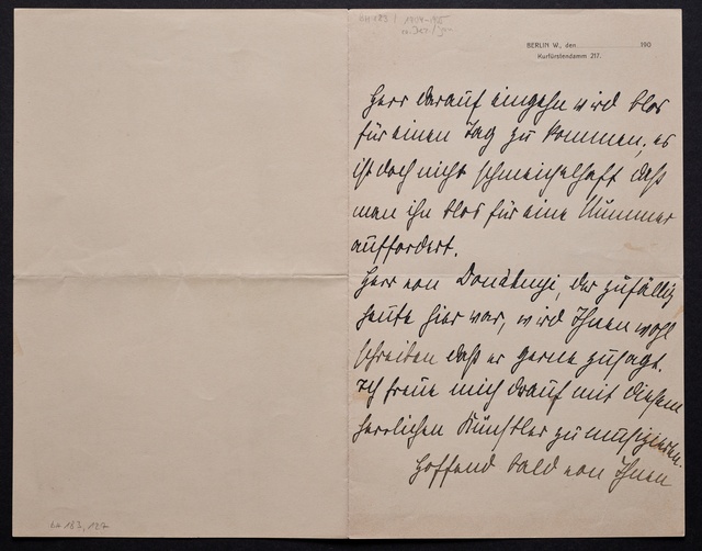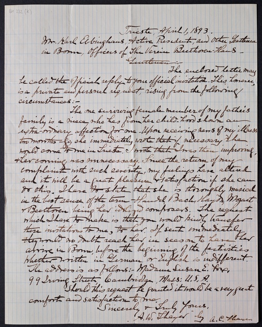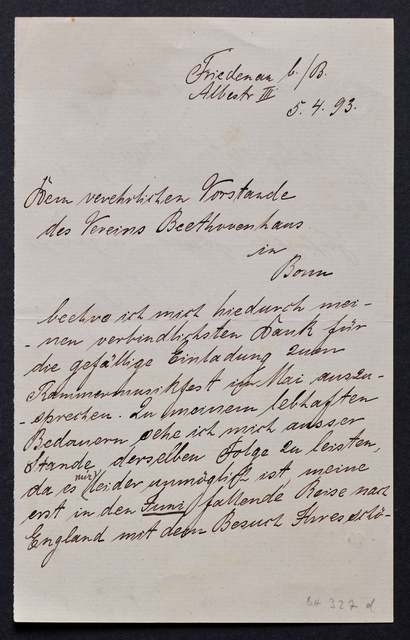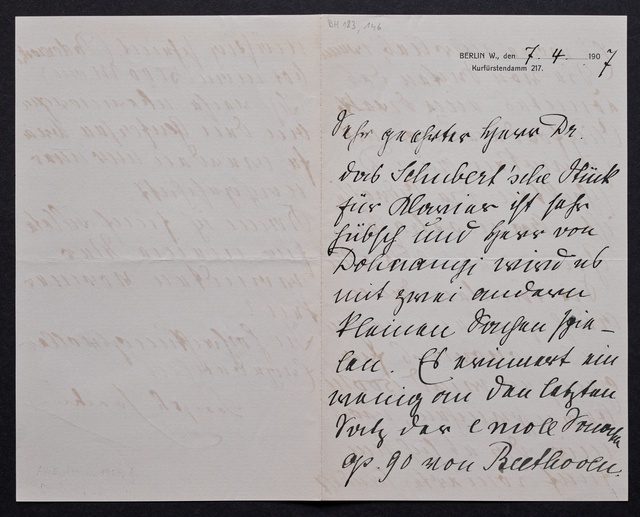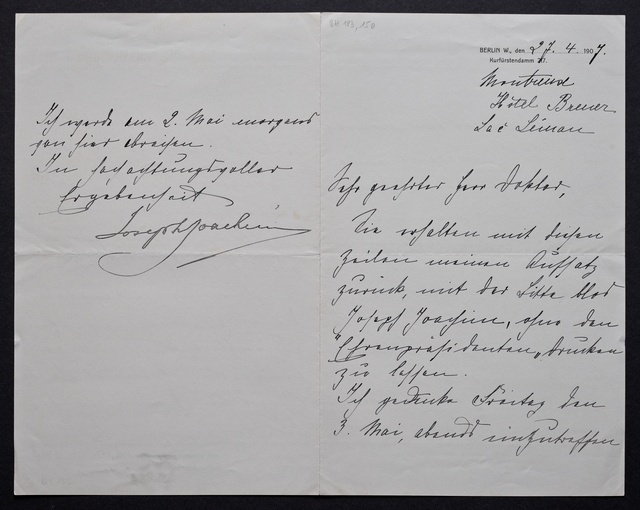 Joseph Joachim, Brief an ein Mitglied des Vorstands des Beethoven-Hauses in Bonn, wahrscheinlich Friedrich Knickenberg, Berlin, 7. April 1907, Diktat