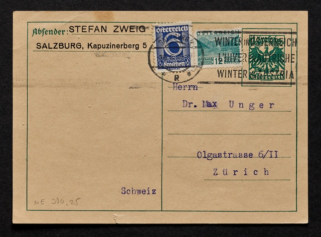 Stefan Zweig, Postkarte an Max Unger, ohne Ort und Datum (London, 25. September 1937), Autograph