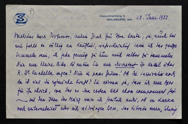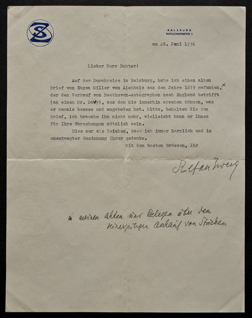 Stefan Zweig, Brief an Max Unger, Salzburg, 28. Juni 1933, Autograph