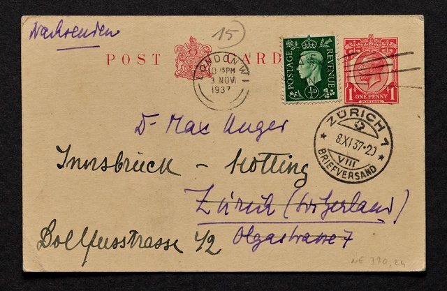 Stefan Zweig, Postkarte an Max Unger, ohne Ort und Datum (London, 3. November 1937), Autograph