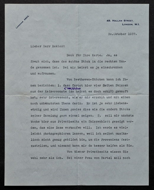 Frederic Lamond, Brief an den Verein Beethoven-Haus in Bonn, London, 15. Dezember 1920, Autograph