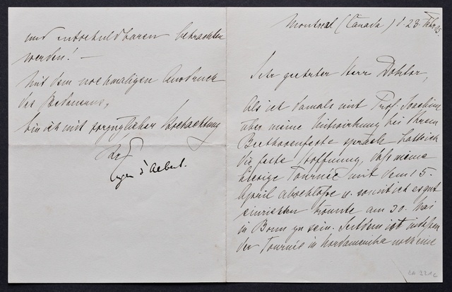 Eugen d'Albert, Brief an Friedrich Knickenberg oder Ferdinand August Schmidt, Montreal, 23. Februar 1905