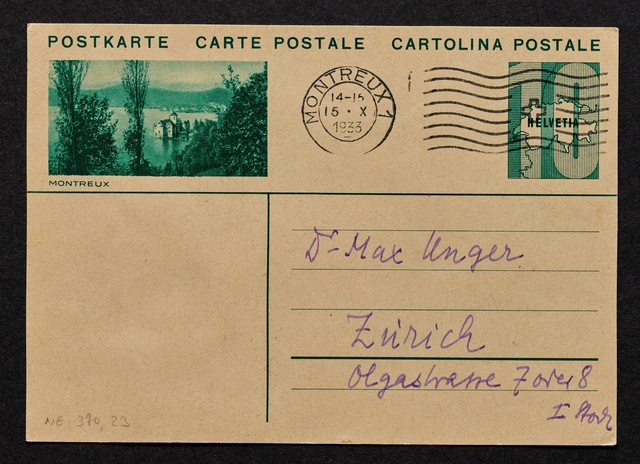 Stefan Zweig, Postkarte an Max Unger, ohne Ort und Datum (Montreux, 15. Oktober 1933), Autograph