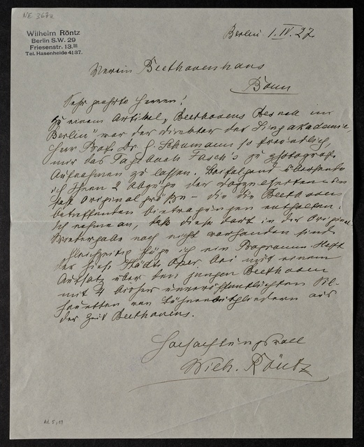 Wilhelm Röntz, Brief an den Verein Beethoven-Haus Bonn, Berlin, 1. April 1927, Autograph