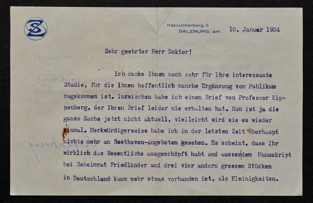 Stefan Zweig, Brief an Max Unger, Salzburg, 10. Januar 1934, Typoskript