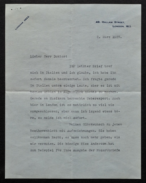Stefan Zweig, Brief an Max Unger, London, 8. März 1937, Typoskript