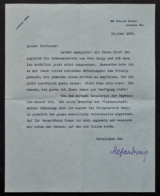 Stefan Zweig, Brief an Max Unger, London, 15. Juni 1938, Typoskript