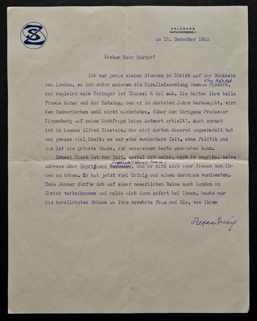 Stefan Zweig, Brief an Max Unger, Salzburg, 12. Dezember 1933, Typoskript