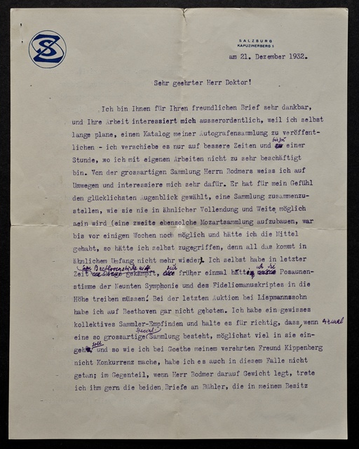 Stefan Zweig, Brief an Max Unger, Salzburg, 21. Dezember 1932, Typoskript