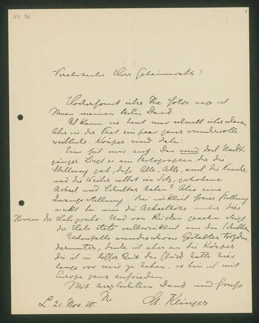 Max Klinger, Brief an einen Geheimrat, Leipzig, 21. November 1910, Autograph