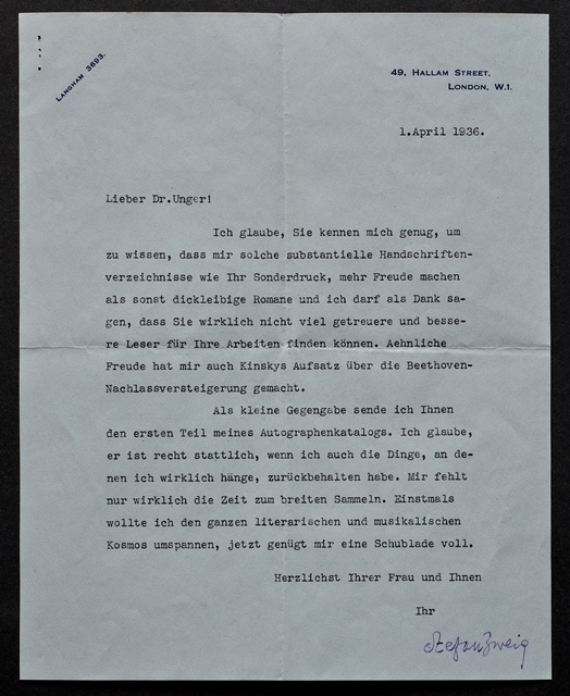 Stefan Zweig, Brief an Max Unger, London, 1. April 1936, Typoskript