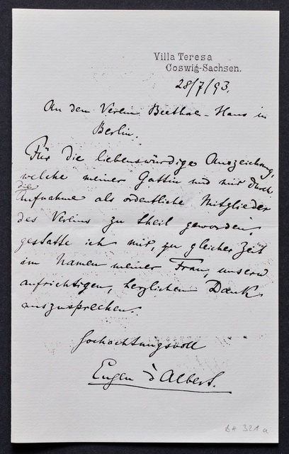 Eugen d'Albert, Brief an den Verein Beethoven-Haus Bonn, Wien, 21. April 1913, Autograph
