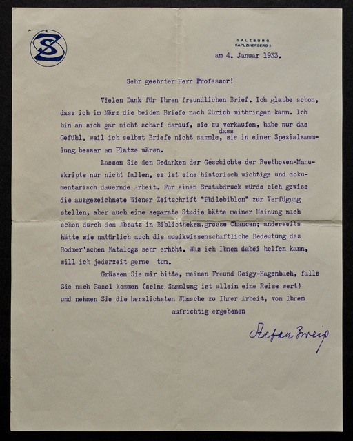 Stefan Zweig, Brief an Max Unger, Salzburg, 4. Januar 1933, Typoskript