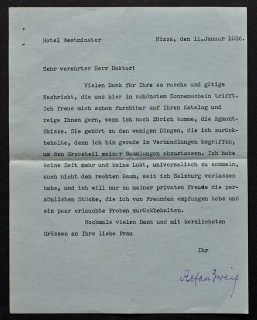 Stefan Zweig, Brief an Max Unger, Nizza, 11. Januar 1936, Typoskript