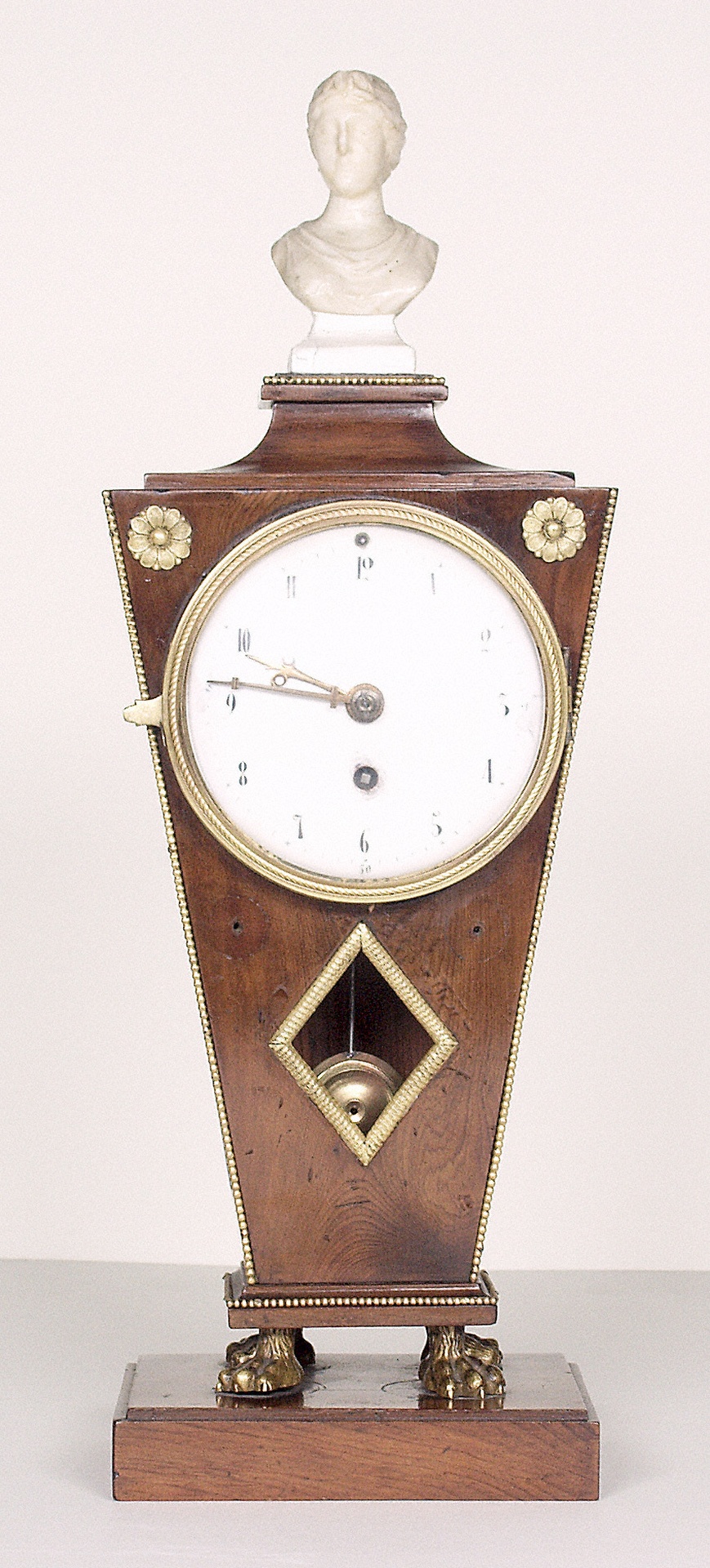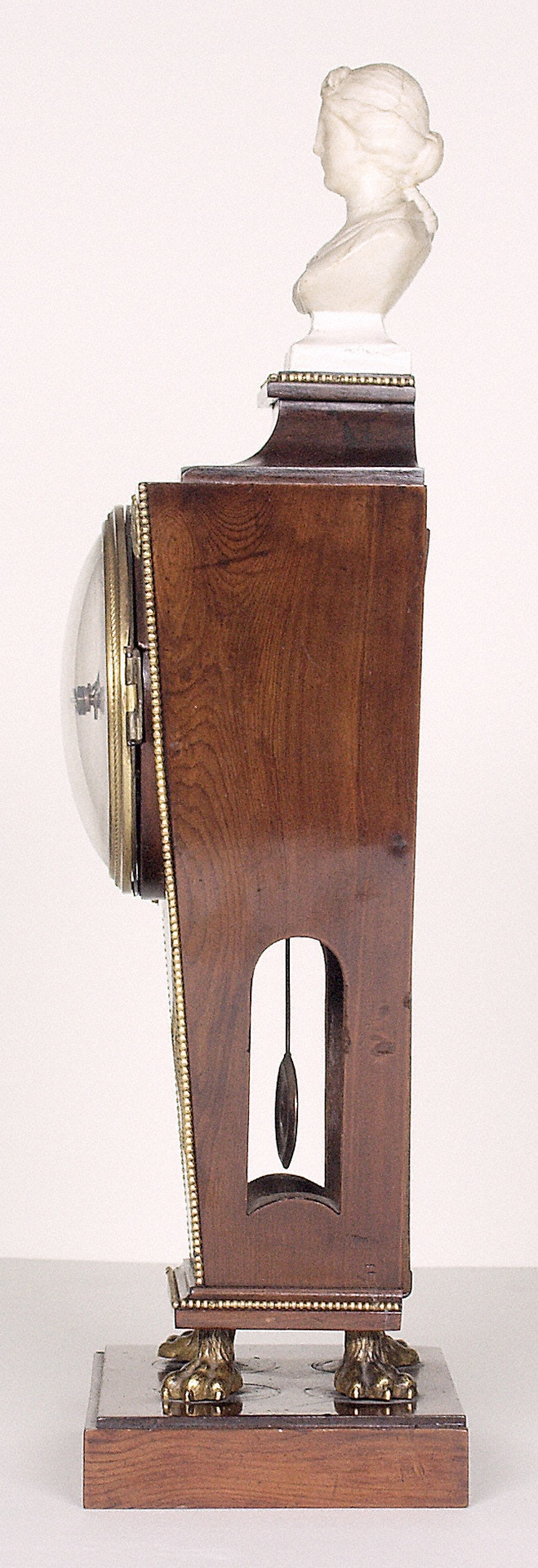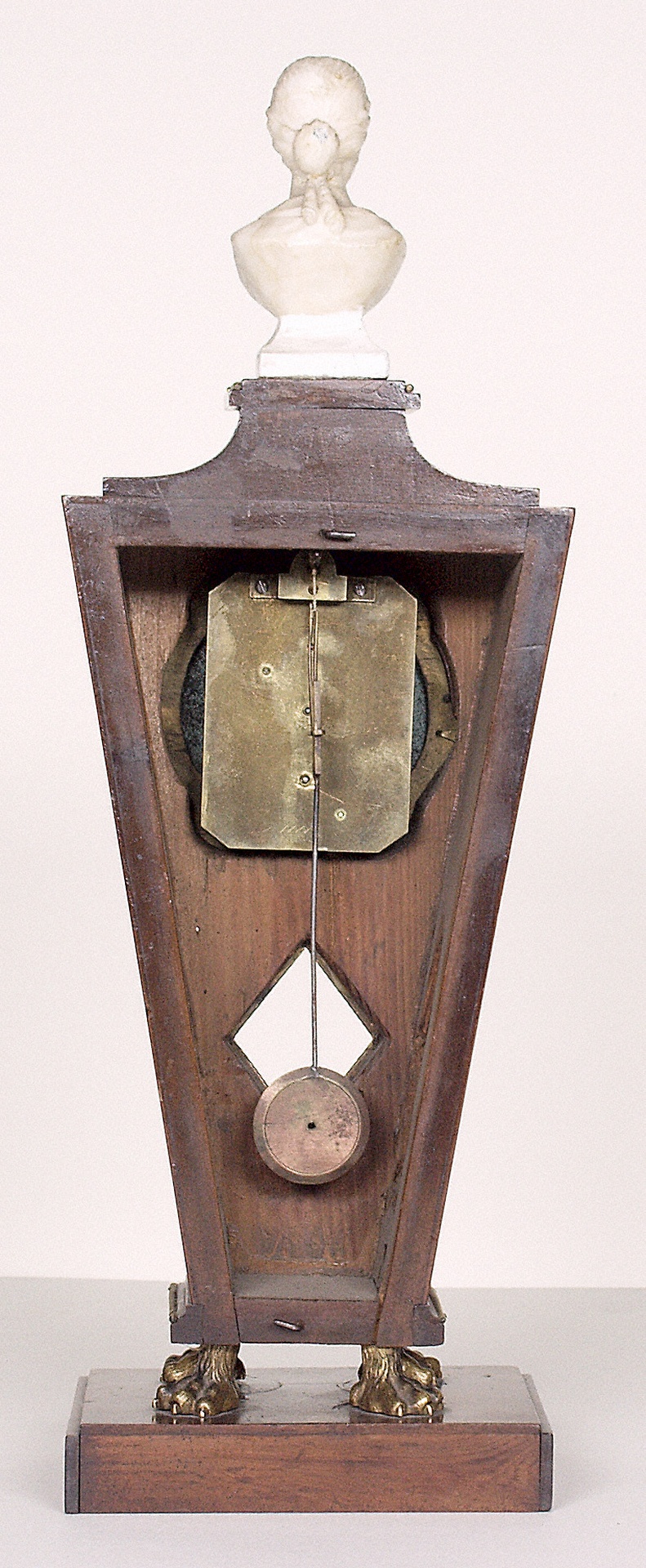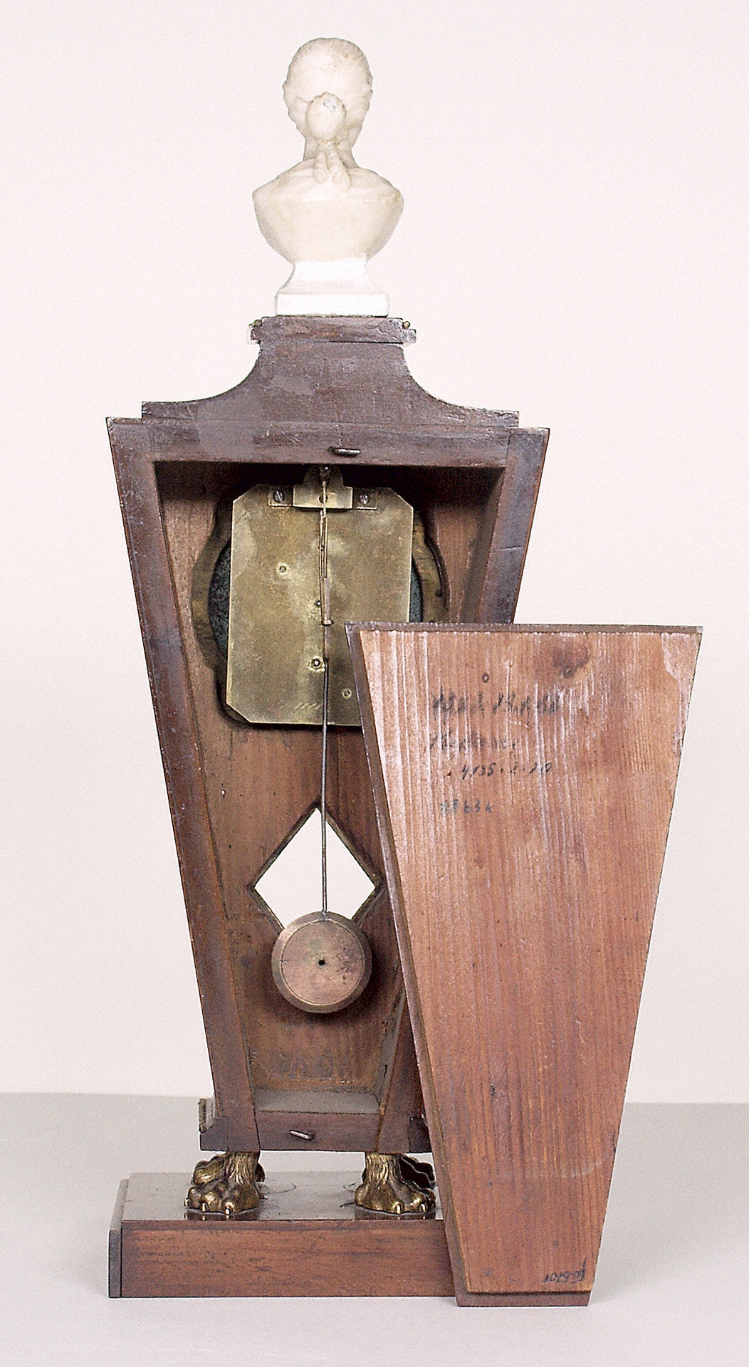 Denn der Komponist besaß nicht nur einige schöne Möbelstücke, wie z.B. den großen Sekretär und das Reise-Schreibpult, die sich heute beide im Beethoven-Haus Bonn befinden, sondern auch verschiedene dekorative und kostbarere Accessoires. Dazu gehörten u.a. ein silberner Becher, ein silberner, innen vergoldeter Salz- und Pfefferbehälter und zwei biedermeierliche Tischstanduhren. Die eine dieser Uhren ist im Beethoven-Haus in Bonn erhalten, die zweite befindet sich in Wien. Während die Wiener Uhr relativ schlicht wirkt, wurde das Gehäuse der hier gezeigten Bonner Uhr recht aufwendig gestaltet. Es steht auf einem Sockel mit bronzenen Löwenfüßen und ist von einer kleinen Elfenbeinbüste bekrönt, die an die Portraits römischer Kaiserinnen erinnert. (S.B.)