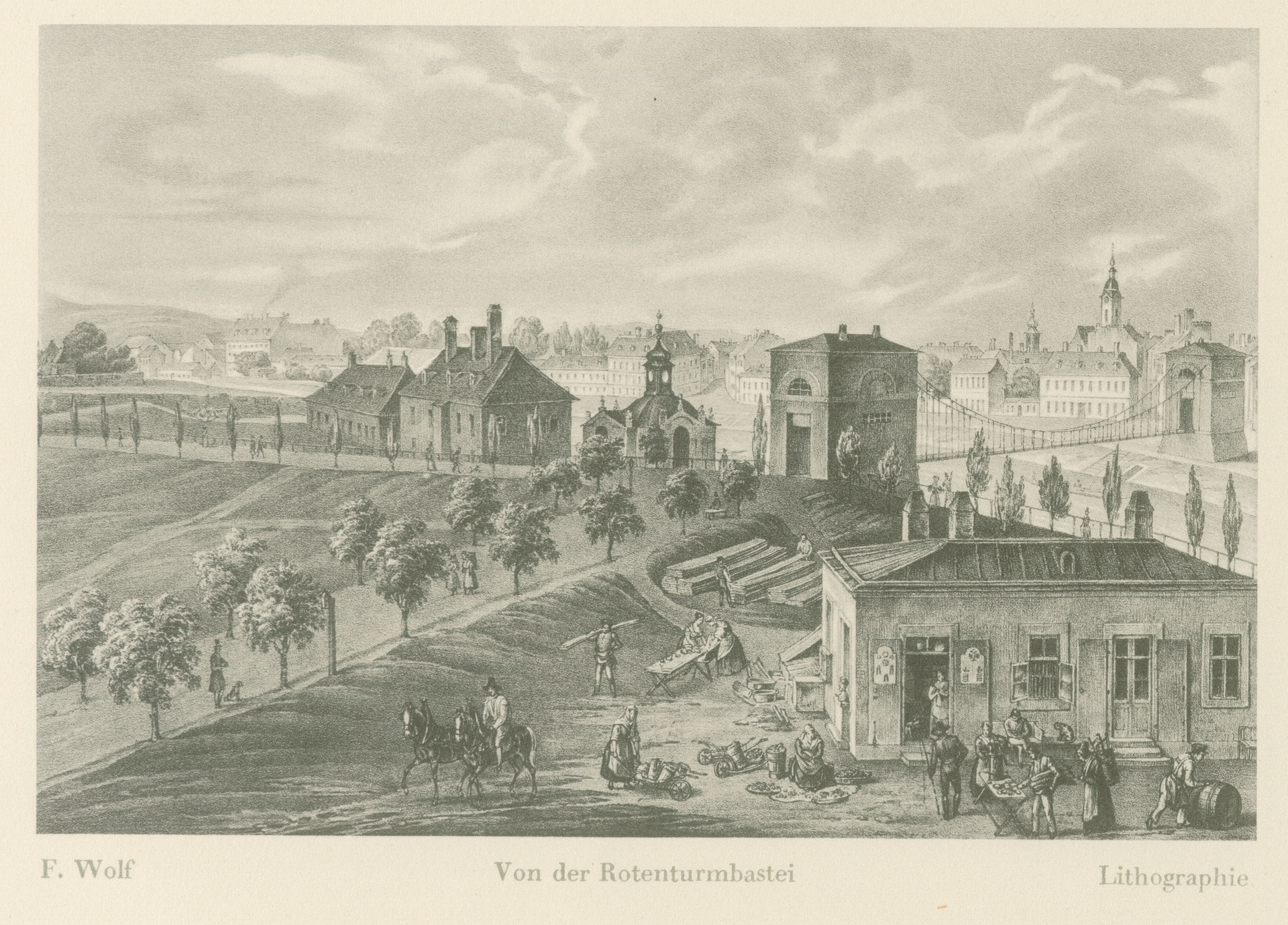 Panorama der Wiener Vorstädte von der Rotenturmbastei aus, um 1840 - Lithographie nach einer Zeichnung von Franz Wolf, Reproduktion, Wien, 1929
