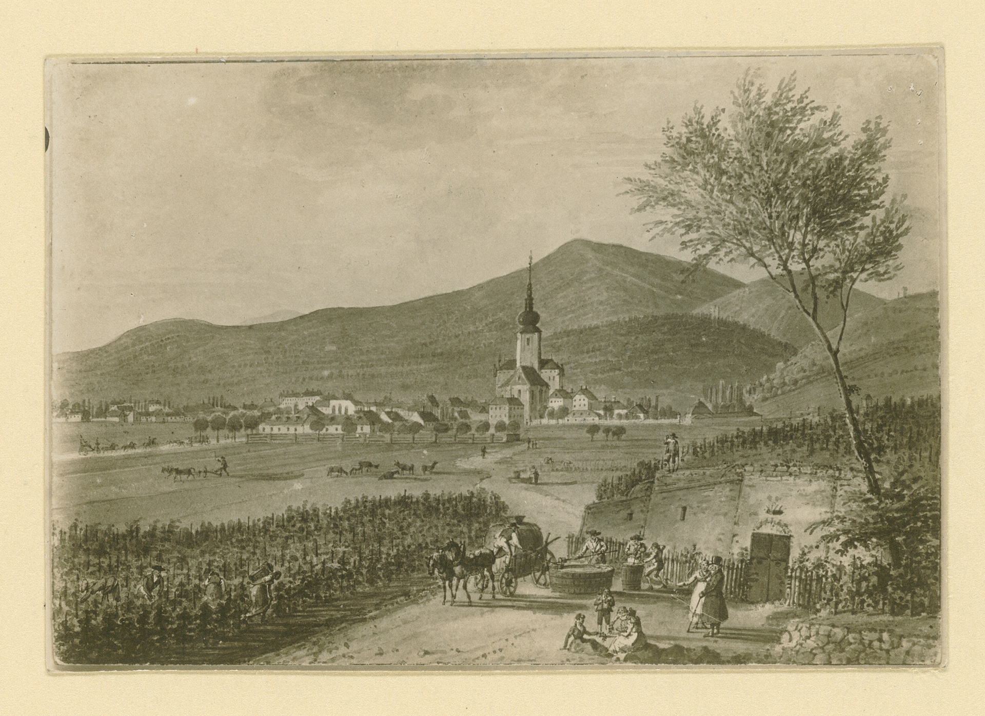 Blick auf den Ort Baden bei Wien, um 1840 - Fotografie eines anonymen Aquarells des 19. Jahrhunderts