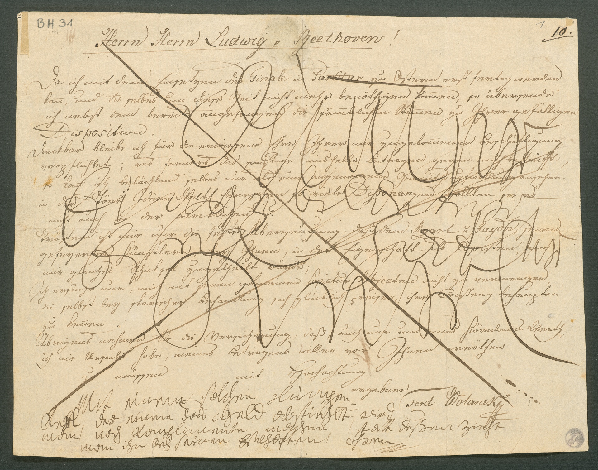 Beethovens Reaktionen auf den Brief bestätigen Wolaneks Vorwurf völlig. Mit wütenden und ausgreifenden Schriftzügen streicht er den Brieftext Wolaneks durch und beschimpft diesen unflätig. Auf der Rückseite entwirft Beethoven eine Antwort, in der er sich jede Belehrung Wolaneks verbittet und ihm Arroganz vorwirft. Einem trotzigen Kind gleich behauptet er, ohnehin sei Wolaneks Kündigung schon längst beschlossene Sache gewesen. (J.R.)