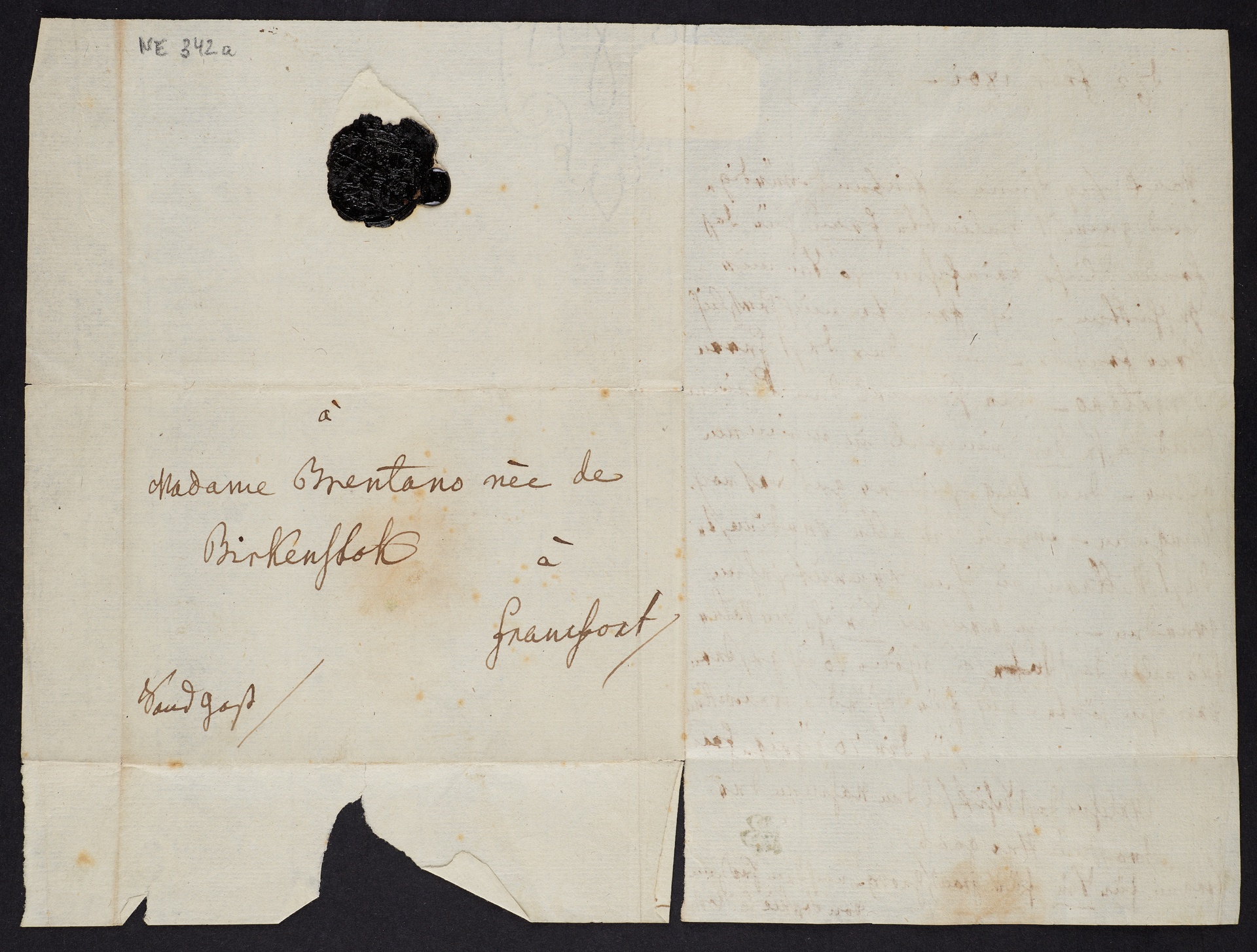 Text: "Dank sey Ihnen - Liebenswürdige und gewiß geliebte Frau für das freundliche Briefchen so Sie mir zuschickten - ich freute mich herzlich Ihrer Freude - und der des Herrn Brentano - den Himmel den Kleinen und lasse Sie einmal in meinem alter - den Tag seiner geburt noch Seegnen - wenn Sie alle verdienste des Vatters in ihm erneut sehen werden - und wenn Sie ihn den Vater für alles das Gute u Schöne so ich gestern von ihm hörte - auch für das edle wohlwollen für die 70jährige Frau welcher das Schiksal den Nahmen der Großmutter gaab/ Seegen für Sie für Franz Georg - auch dem Großen von Sophie la Roche" (F. G.)