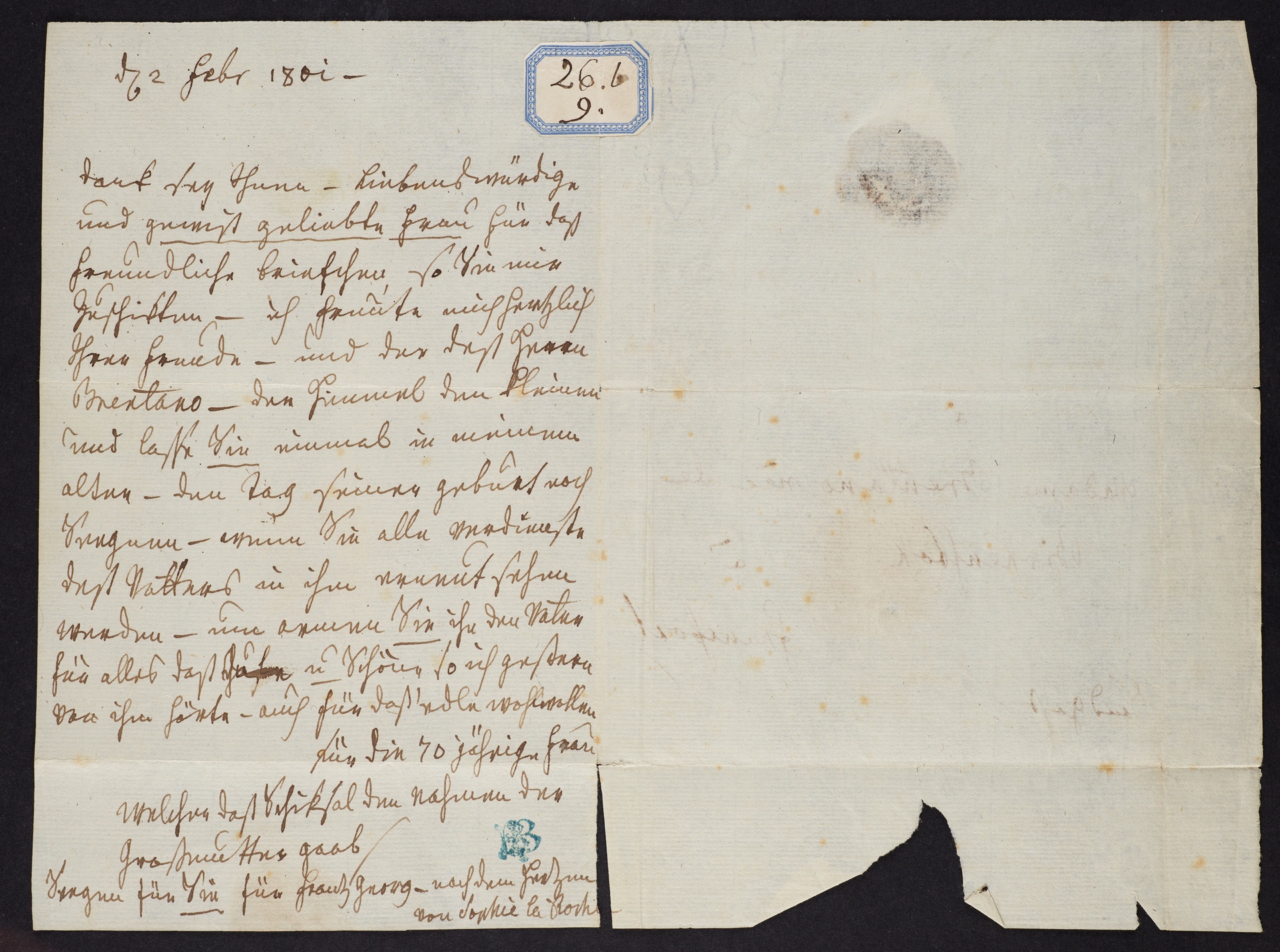Sophie von La Roche, Brief an Antonie Brentano in Frankfurt, 2. Februar 1801, Autograph