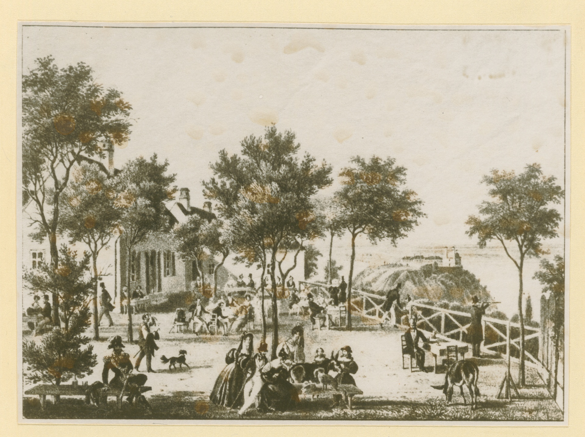 Die Wirtschaft auf dem Kahlenberg in Wien, um 1850 - Fotografie einer Lithographie von Johann Raulino, vielleicht nach einer eigenen Zeichnung