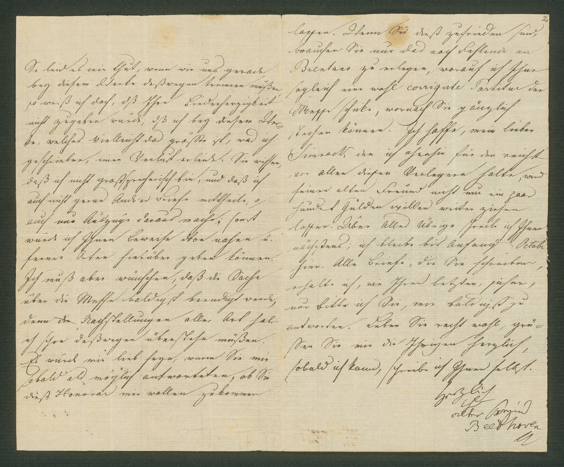 Dieses Schreiben gehört zur umfangreichen Korrespondenz Beethovens mit diversen Verlegern, denen er allen versucht, möglichst teuer seine Missa solemnis op. 123 zu verkaufen. Anfang der 1820er Jahre befand sich Beethoven in großen finanziellen Schwierigkeiten, ein hoher Preis für sein derzeit größtes Werk war auch eine existenzielle Frage. Nahezu allen großen Verlegern bietet Beethoven die Messe an und versucht, diese preislich gegeneinander auszuspielen. Den von Simrock gebotenen Betrag hält er für zu gering und bittet ihn nun, die Summe noch einmal zu überdenken - nicht ohne mit Verweis auf andere Anbieter Druck auszuüben. Er verspricht, bei einer entsprechenden Zahlung umgehend über Brentano in Frankfurt die Partitur zu schicken. Beethoven drängt auf baldige Antwort und droht damit, die Messe andernfalls einem anderen Verleger zu verkaufen.