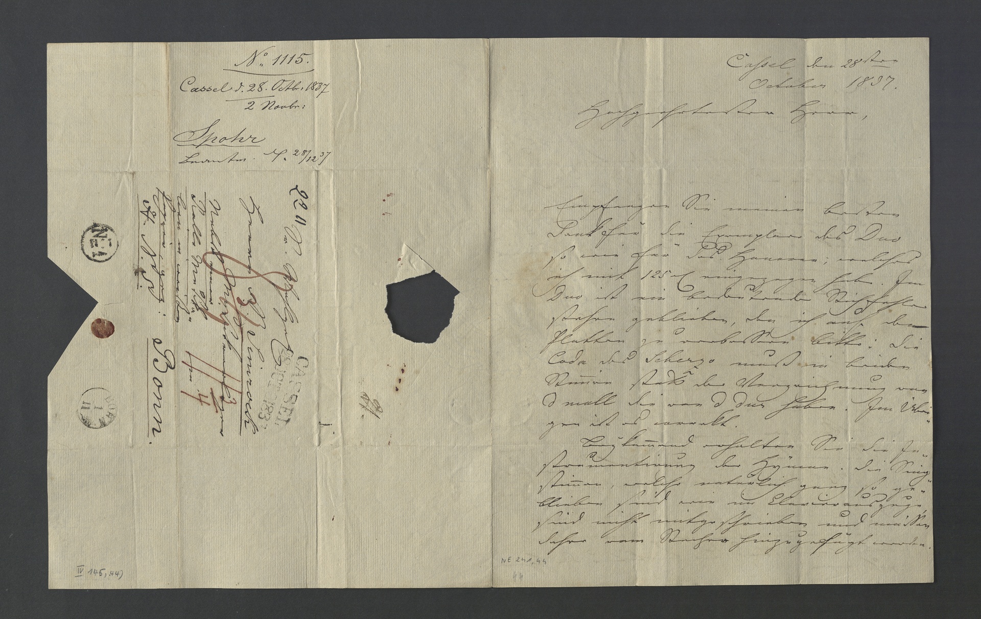 Spohr teilt einen Stichfehler im Druck des Duos op. 96 mit und schickt die Instrumentierung der Hymne op. 98 nach Bonn. Er bedauert, keine Abschrift der Partitur seines Oratorium "Die letzten Dinge" WoO 61 machen zu können, da er seine Partitur verliehen habe, verweist den Verlag aber auf Herrn Verkenius in Köln, der eine solche besitze.