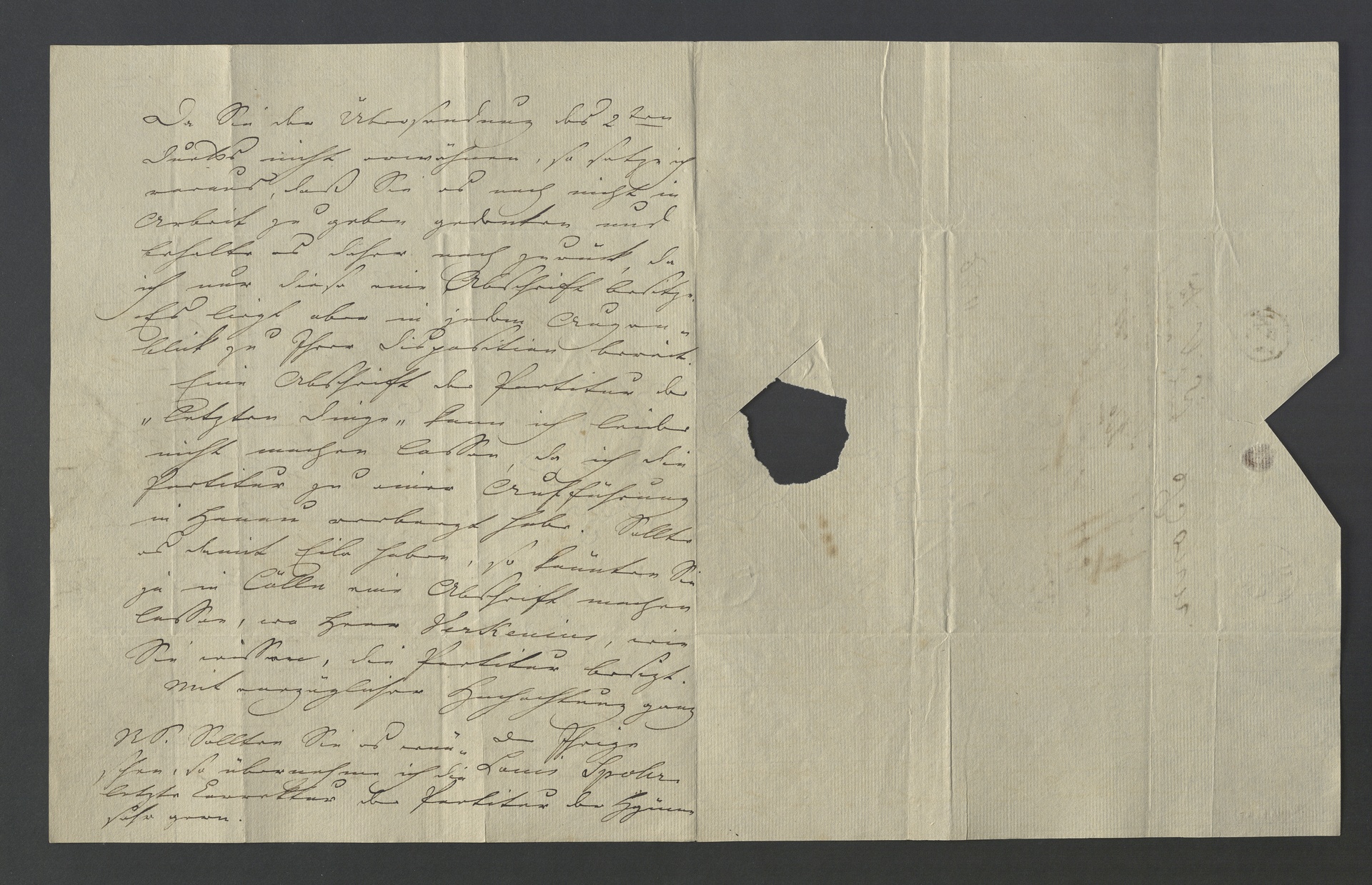 Text: Wohlgeborner Herr, Empfangen Sie meinen besten Dank für die Exemplare des Duo so wie für das Honorar, welches ich mit 125 Rth. eingezogen habe. Im Duo ist ein bedeutender Stichfehler stehen geblieben, den ich auf den Platten zu verbessern bitte: Die Coda des Scherzo muß in beiden Stimmen statt der Vorzeichnung von D moll die von D Dur haben. Im Übrigen ist es correkt. Beykommend erhalten Sie die Instrumentierung der Hymne. Die Singstimmen, welche natürlich ganz so geblieben sind wie im Clavierauszuge, sind nicht mitgeschrieben und müssen daher vom Stecher hinzugefügt werden. Da Sie die Übersendung des 2ten Duetts nicht wünschen, so setze ich voraus, daß Sie es noch nicht in Arbeit zu geben gedenken und behalte es daher noch zurück, da ich nur diese eine Abschrift besitze. Es liegt aber in jedem Augenblick zu Ihrer Disposition bereit. Eine Abschrift der Partitur der "letzten Dinge" kann ich leider nicht machen lassen, da ich die Partitur zu einer Aufführung in Hanau verborgt habe. Sollte es damit Eile haben, so könnten Sie ja in Cölln eine Abschrift machen lassen, wo Herr Verkenius, wie Sie wissen, die Partitur besitzt. Mit vorzüglicher Hochachtung ganz der Ihrige Louis Spohr"