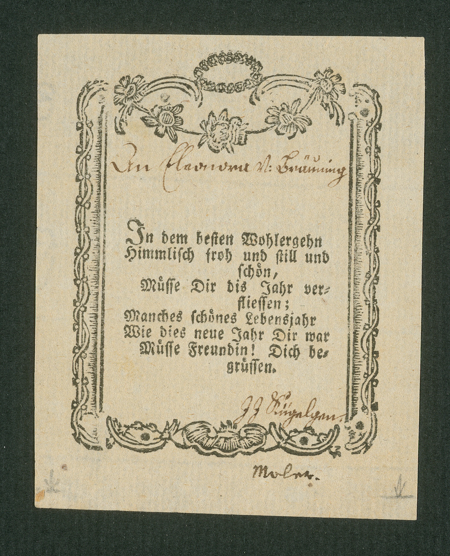 Joseph Ignaz von Kügelgen, Neujahrsgruß an Eleonore von Breuning, Bonn, letztes Viertel 18. Jahrhundert, Autograph, Druck