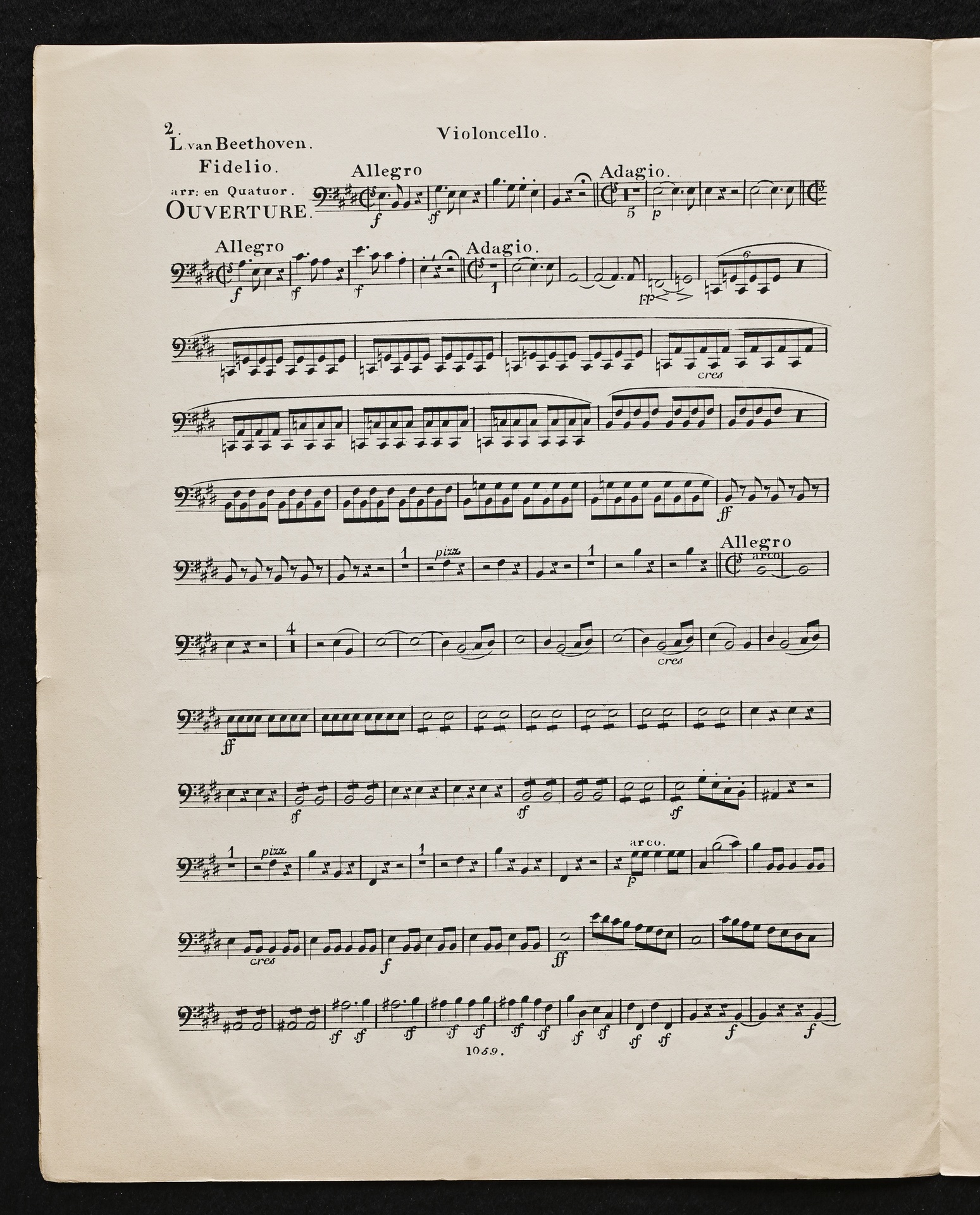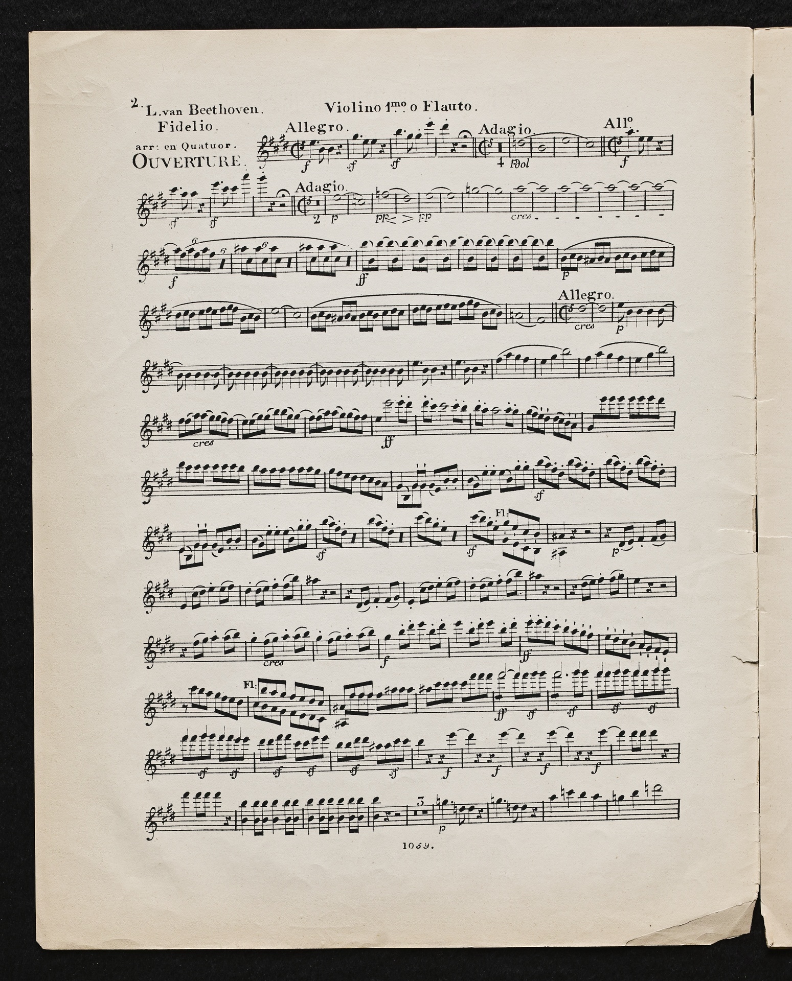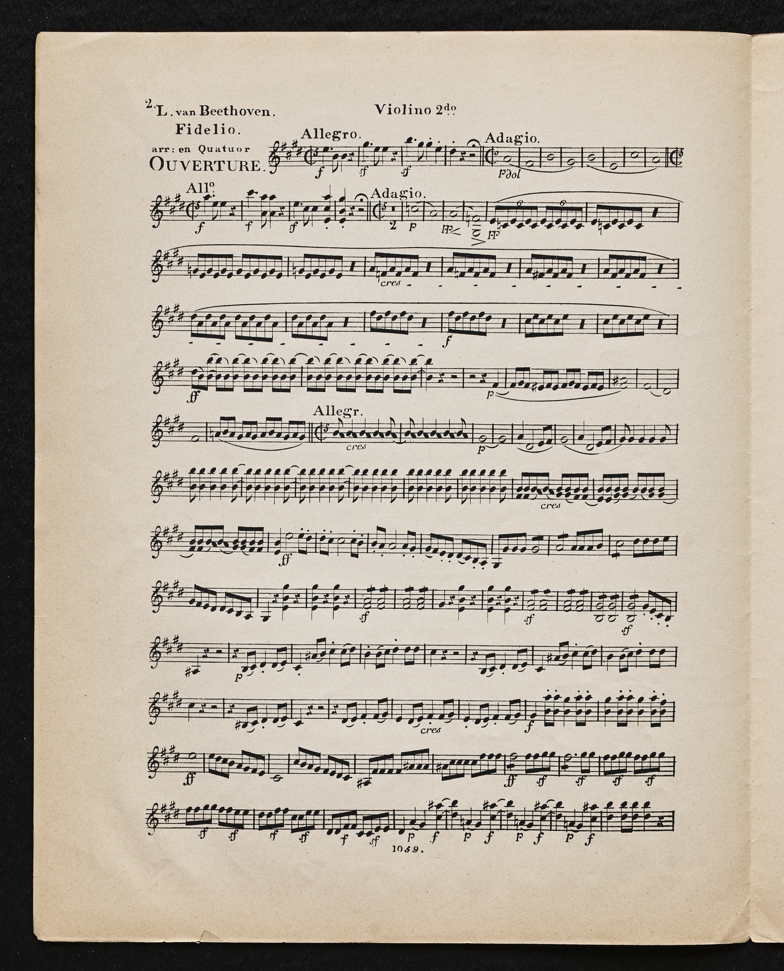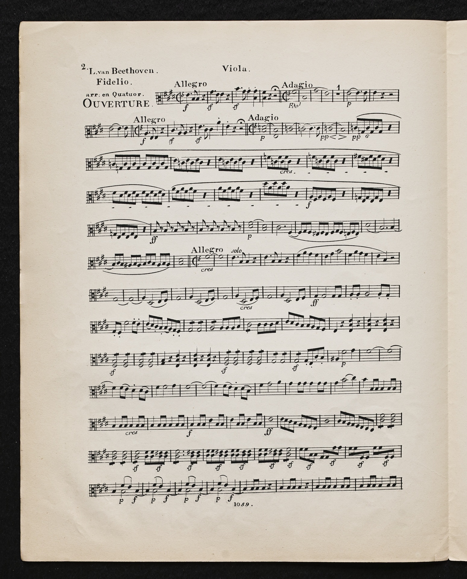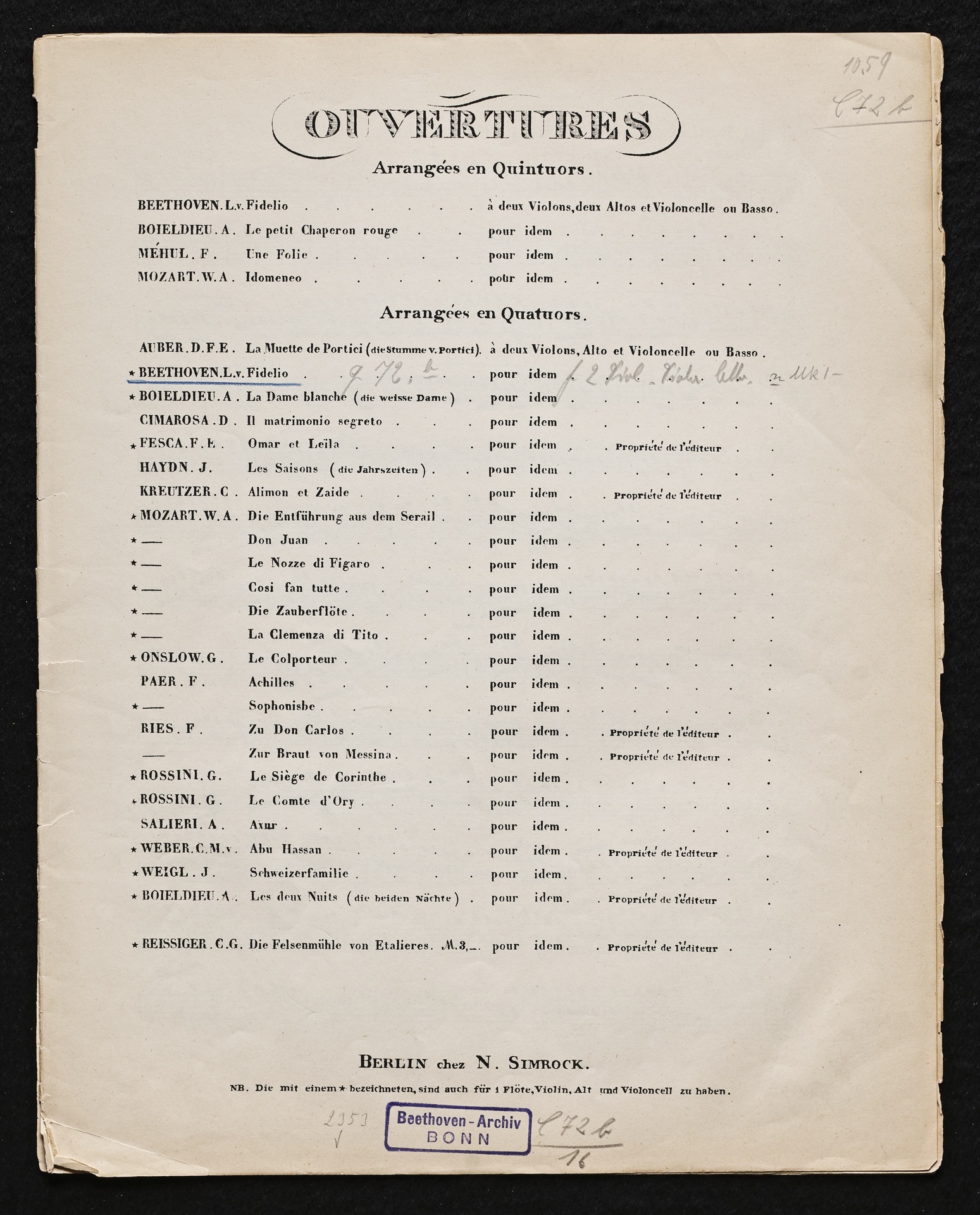 Ludwig van Beethoven, Fidelio op. 72, 3. Fassung 1814, Ouvertüre (E-Dur), Bearbeitung für 2 Violinen, Viola und Violoncello, Stimmen, Simrock, 1059