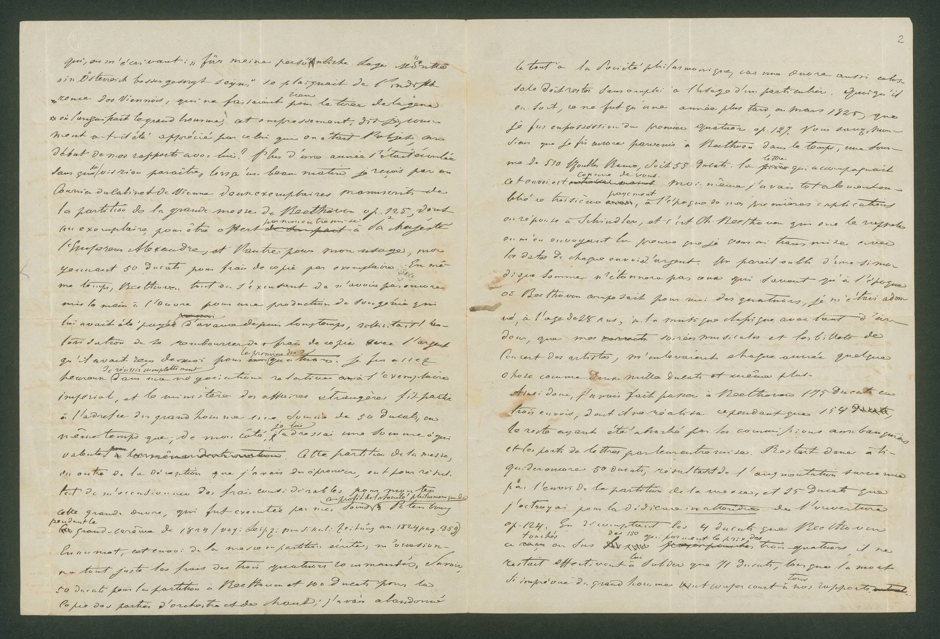 Galitzin beklagt sich bitter bei Brendel, dem Redakteur der Neuen Zeitschrift für Musik. Galitzin wurde von Schindler öffentlich vorgeworfen, er habe Beethovens Honorarforderungen für die drei Streichquartette op. 127, 130 und 133, die dieser in Galitzins Auftrag komponiert hatte, nicht beglichen. Der Fürst hatte erwartet, Brendel würde eine Richtigstellung des Sachverhaltes bringen. Jetzt muss er feststellen, dass Schindler in der Neuauflage seiner Beethoven-Biographie seine Vorwürfe gegen Galitzin wiederholt. Wilhelm von Lenz dagegen werde in seinem neuen Buch diesen Anschuldigungen wiedersprechen. Um jede Polemik auszuräumen, bittet Galitzin inständig um eine offizielle Stellungnahme Brendels, der die Fakten öffentlich machen soll. Tatsächlich hat Brendel in der 2. Auflage seiner Musikgeschichte den Abschnitt entfernt, der noch in der 1. Auflage Schindlers unwahre Behauptungen wiedergab.
