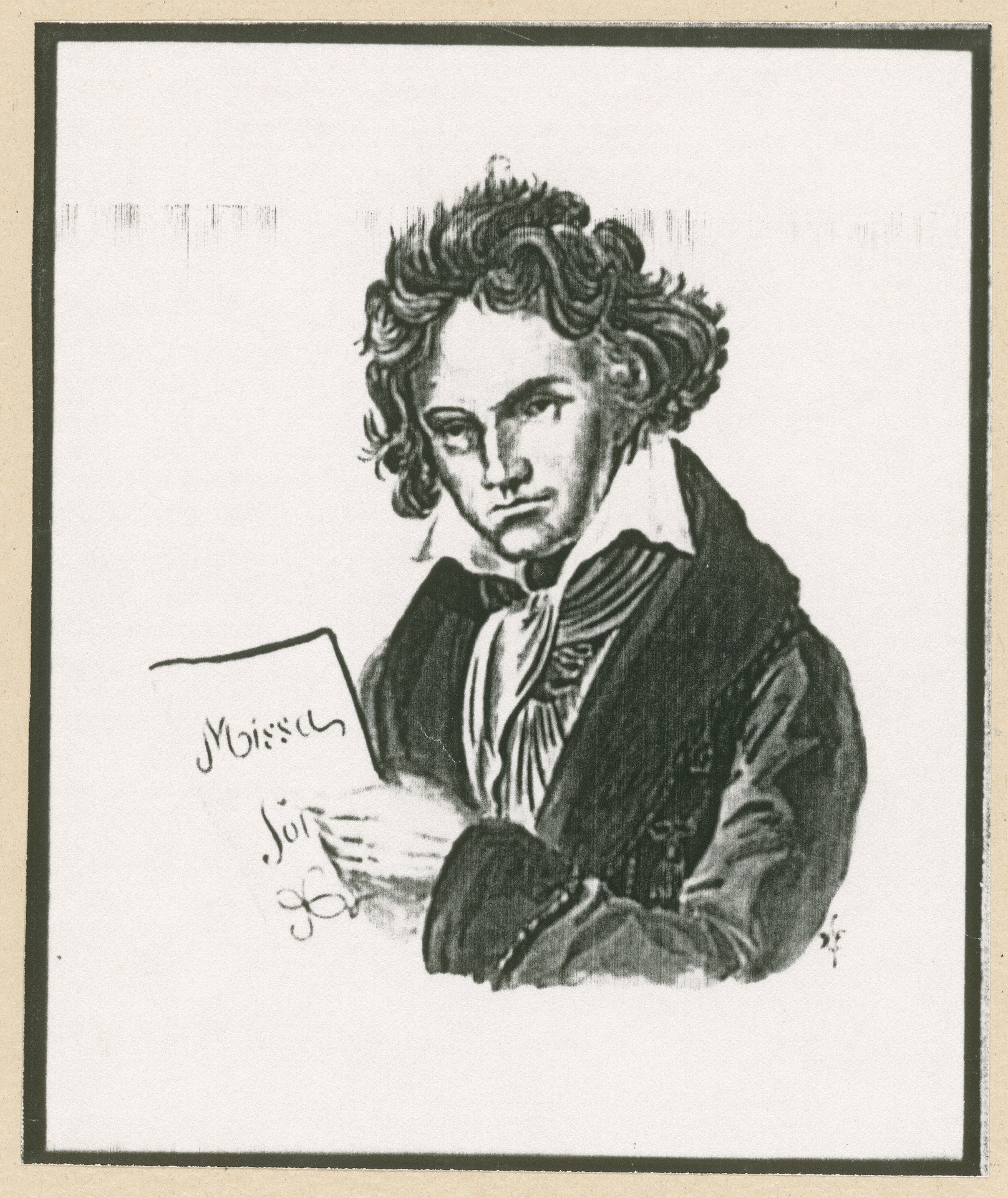 Ludwig van Beethoven mit dem Manuskript der Missa solemnis, 1820 - Zeichnung von Schöneck nach dem Gemälde von Joseph Karl Stieler aus dem Jahr 1820, Xerokopie, Bonn, um 1985