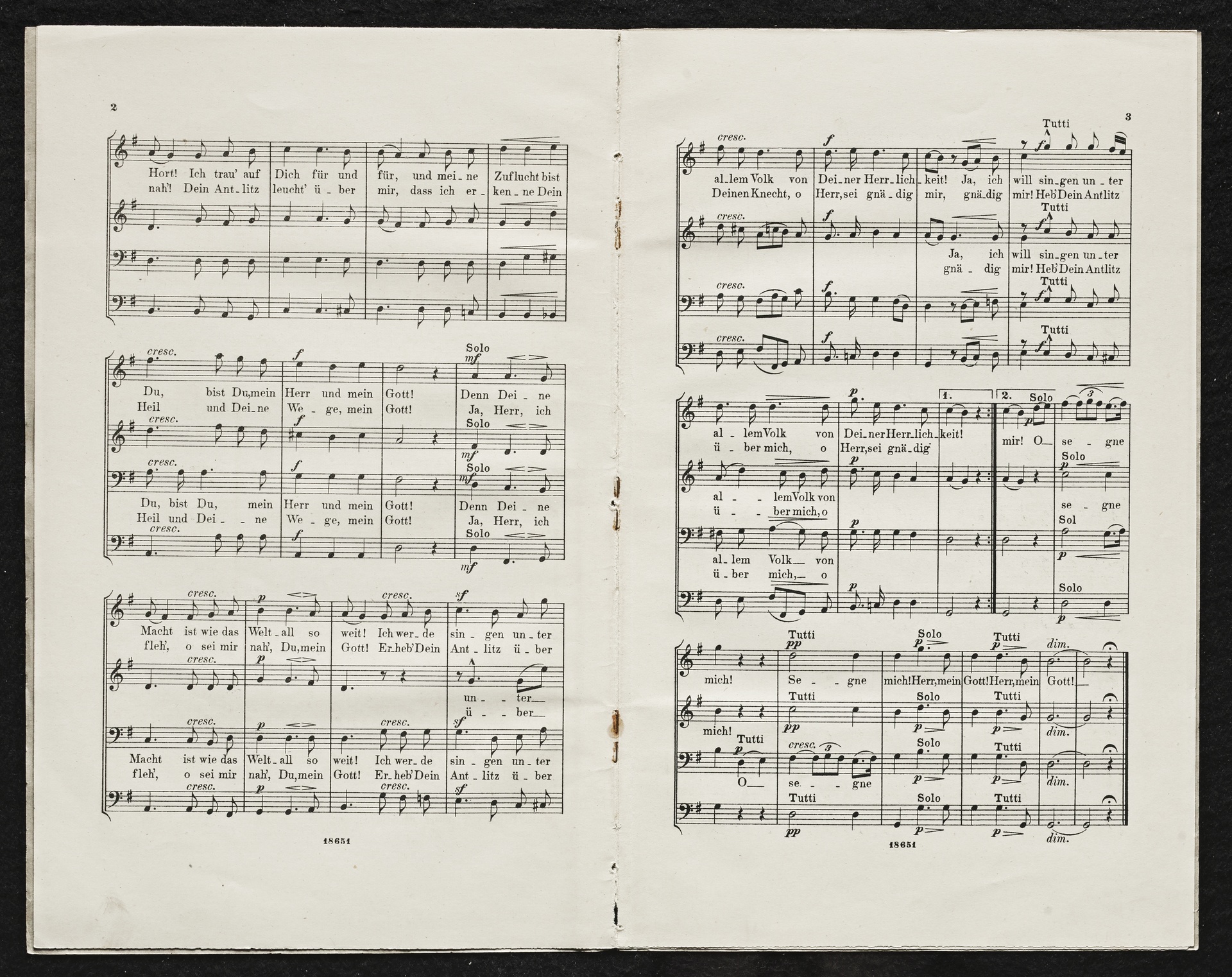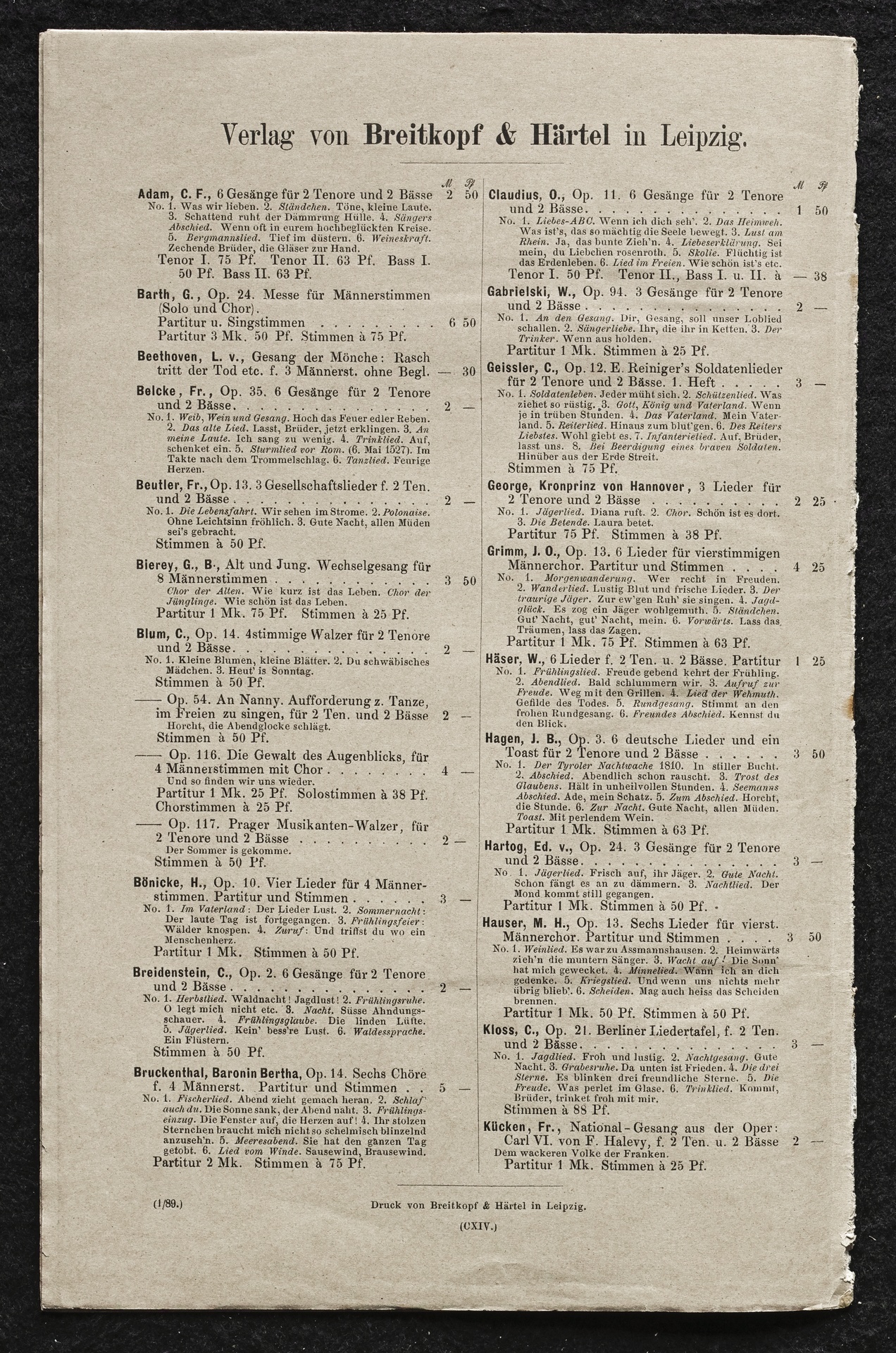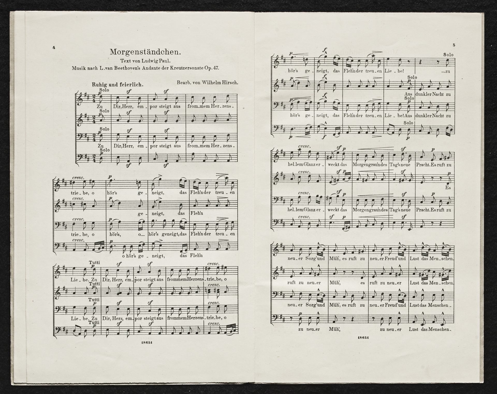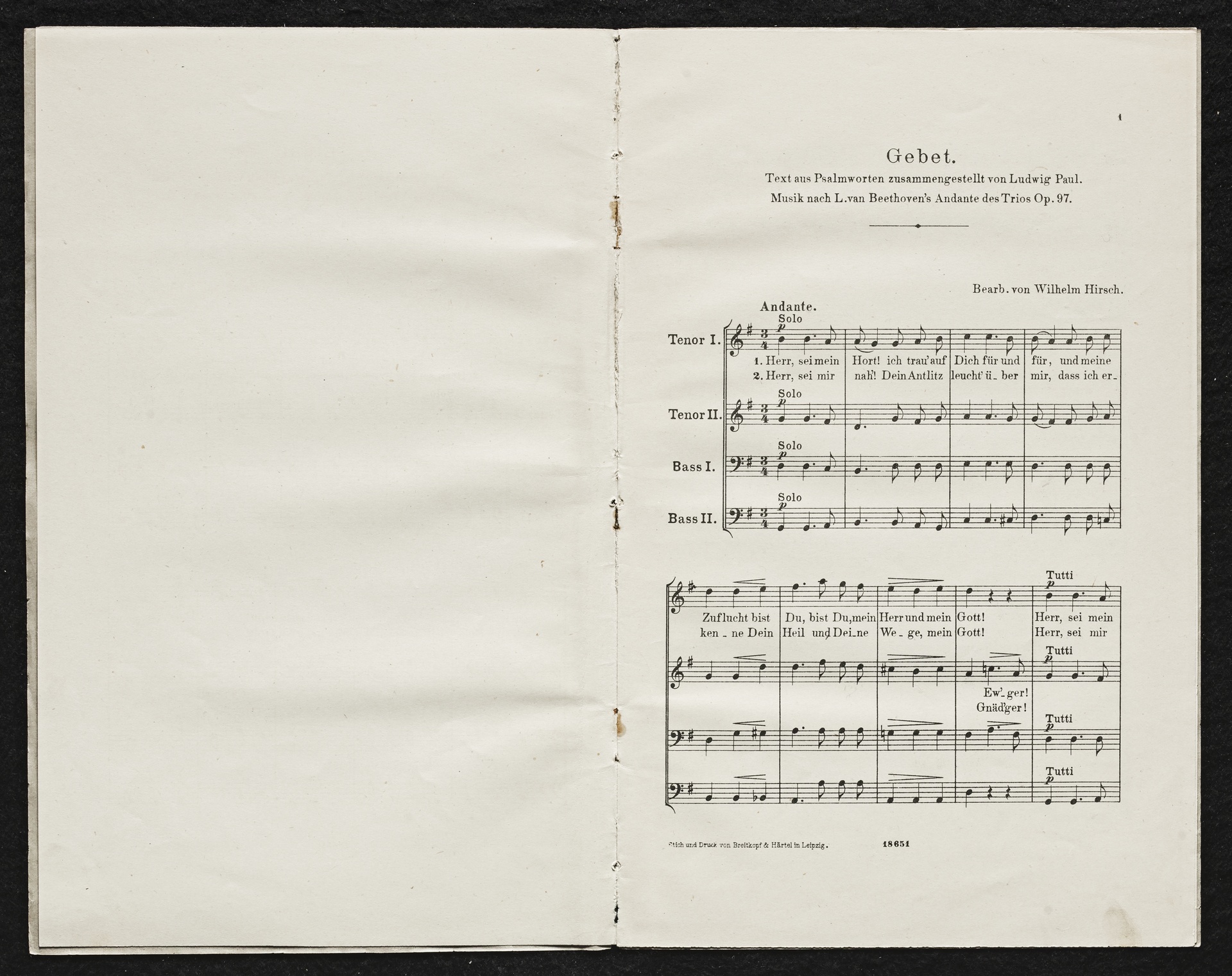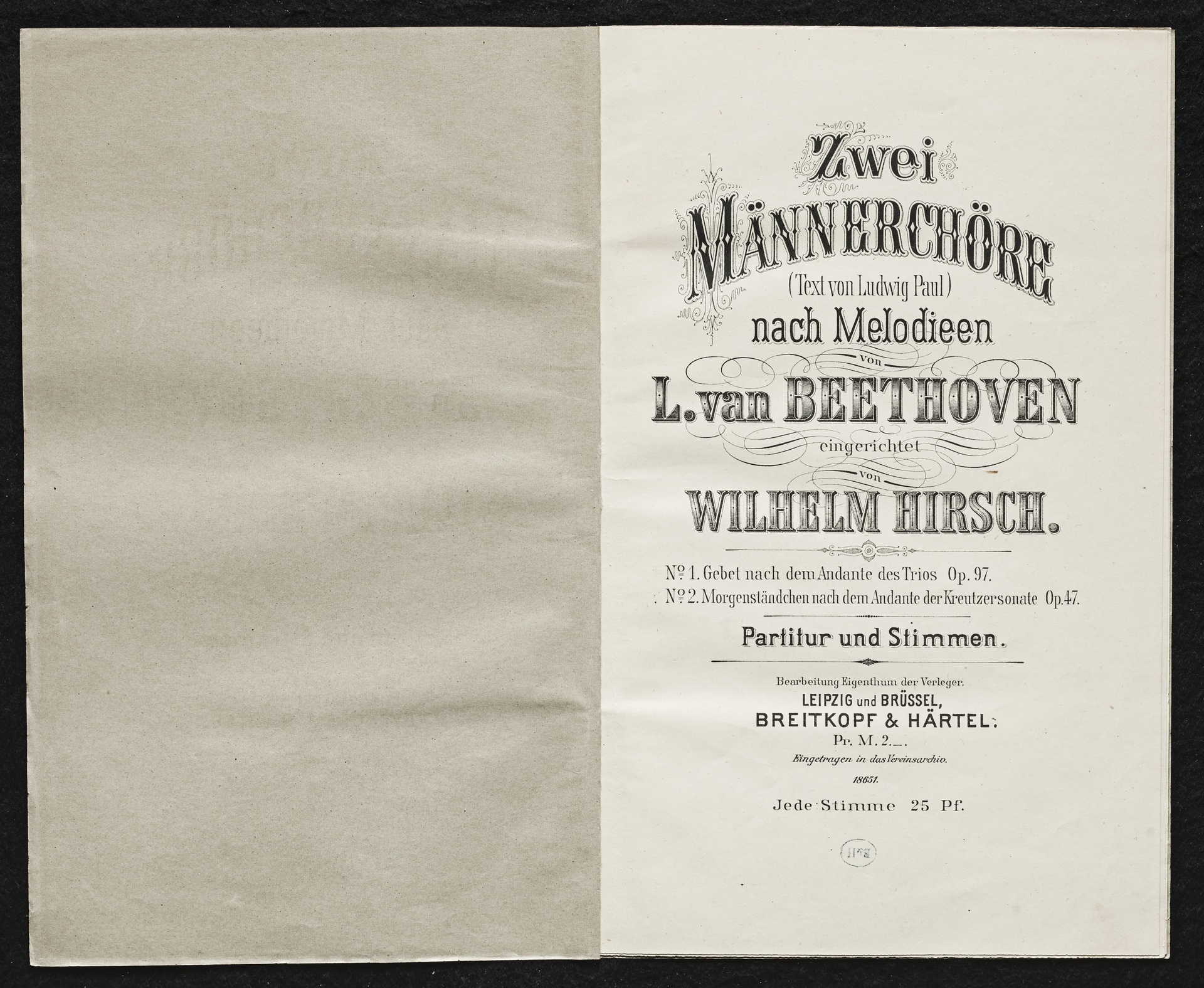 Ludwig van Beethoven, Trio für Klavier, Violine, Violoncello (B-Dur) und Sonate für Klavier und Violine (A-Dur) op. 97, 3. Satz op. 47, 2. Satz, Bearbeitung für Männerchor von Wilhelm Hirsch, Partitur, Breitkopf und Härtel, 18651