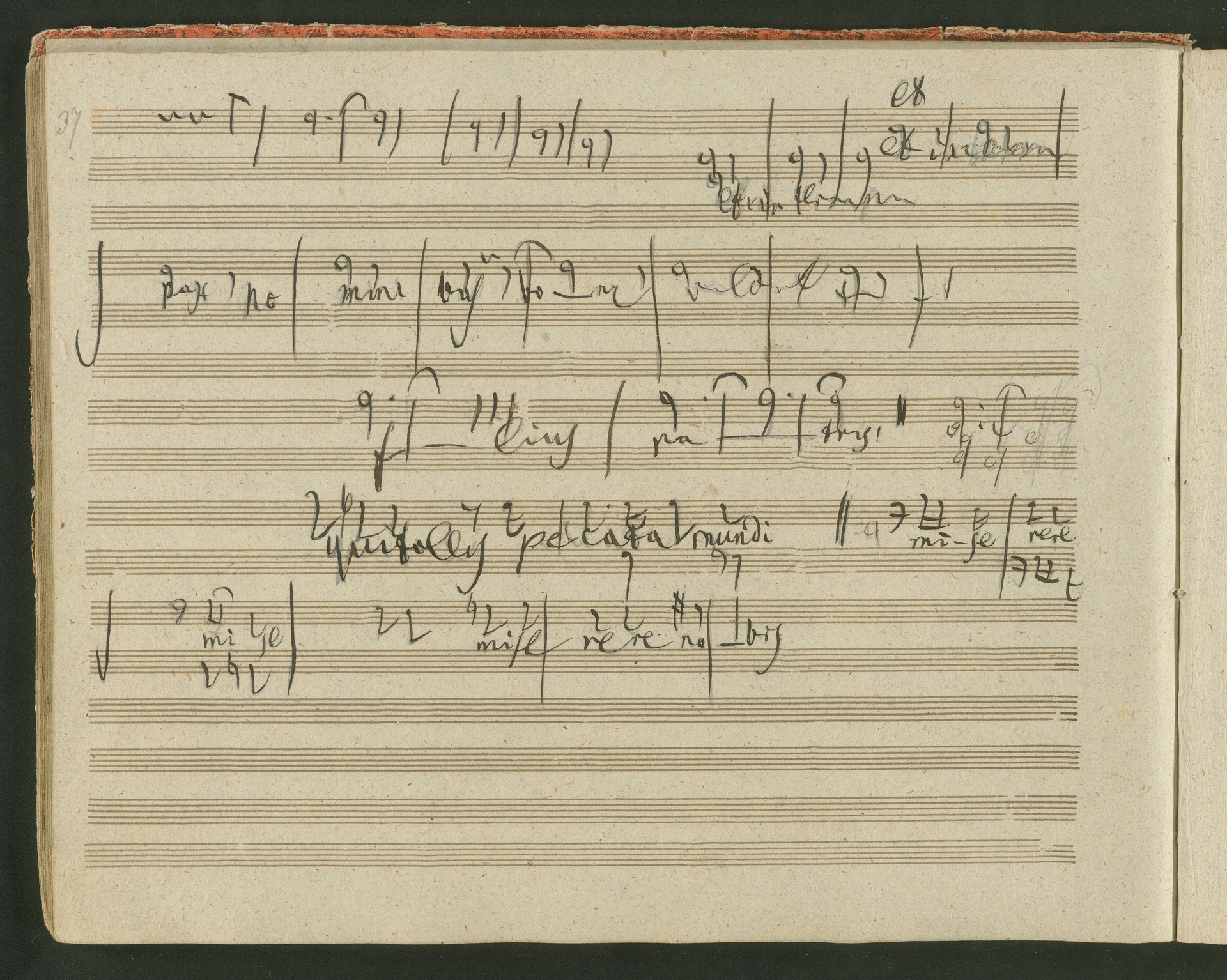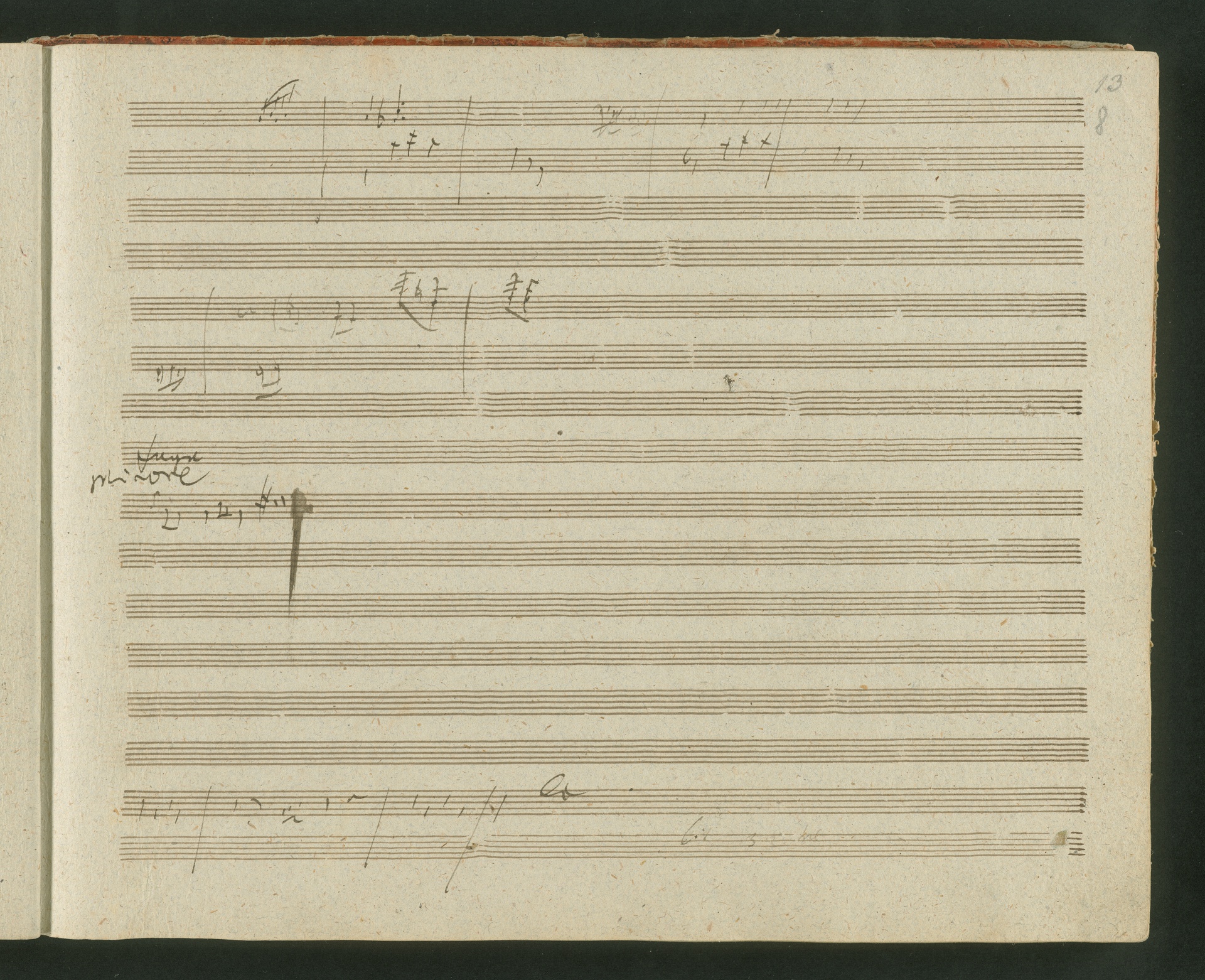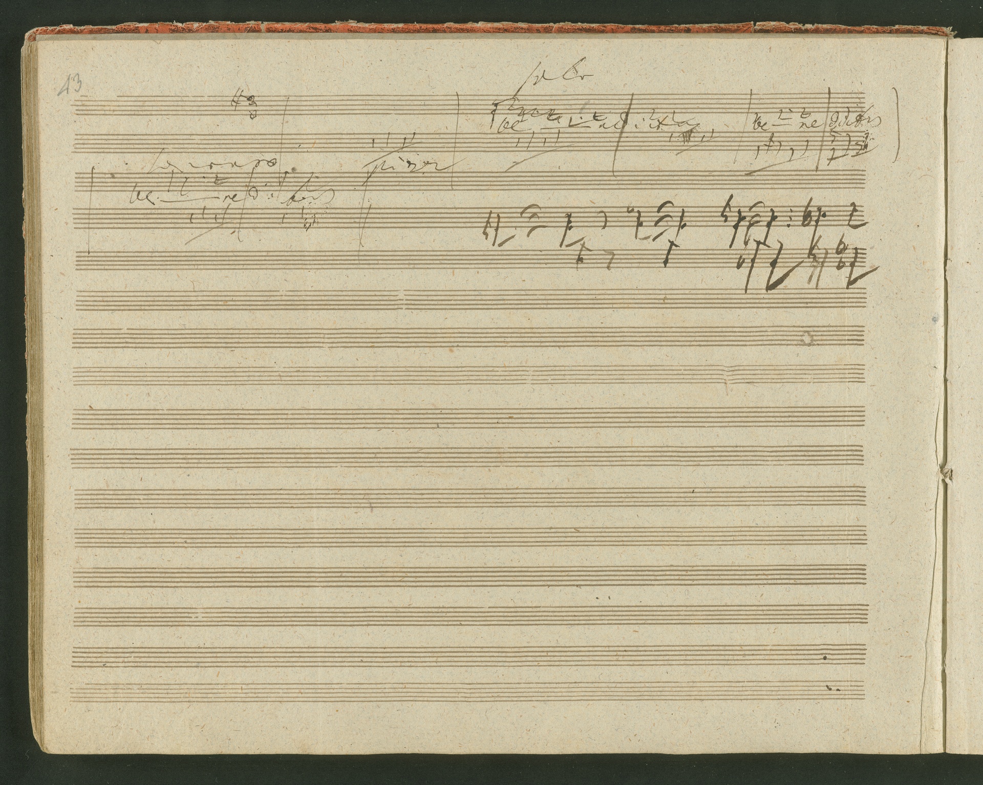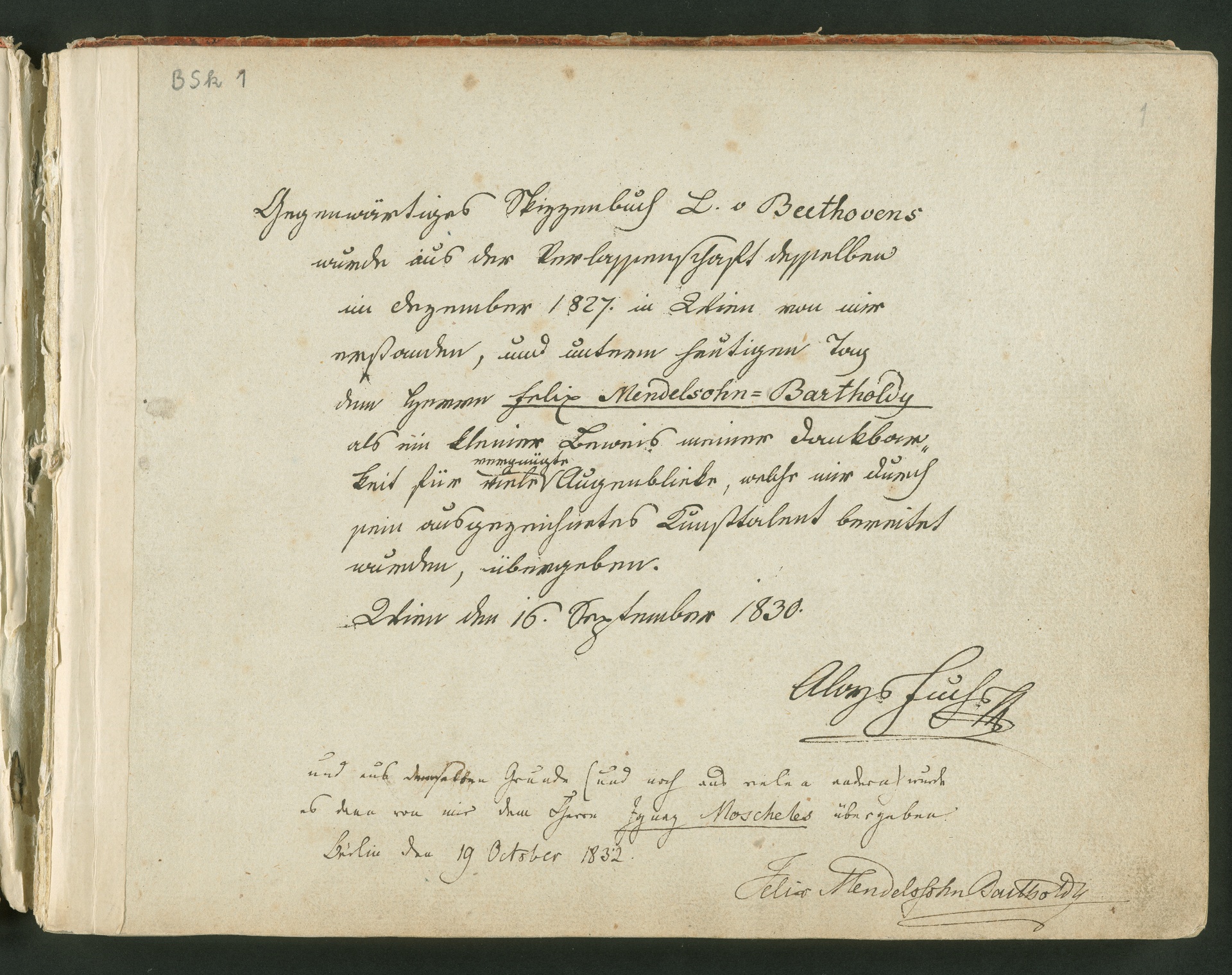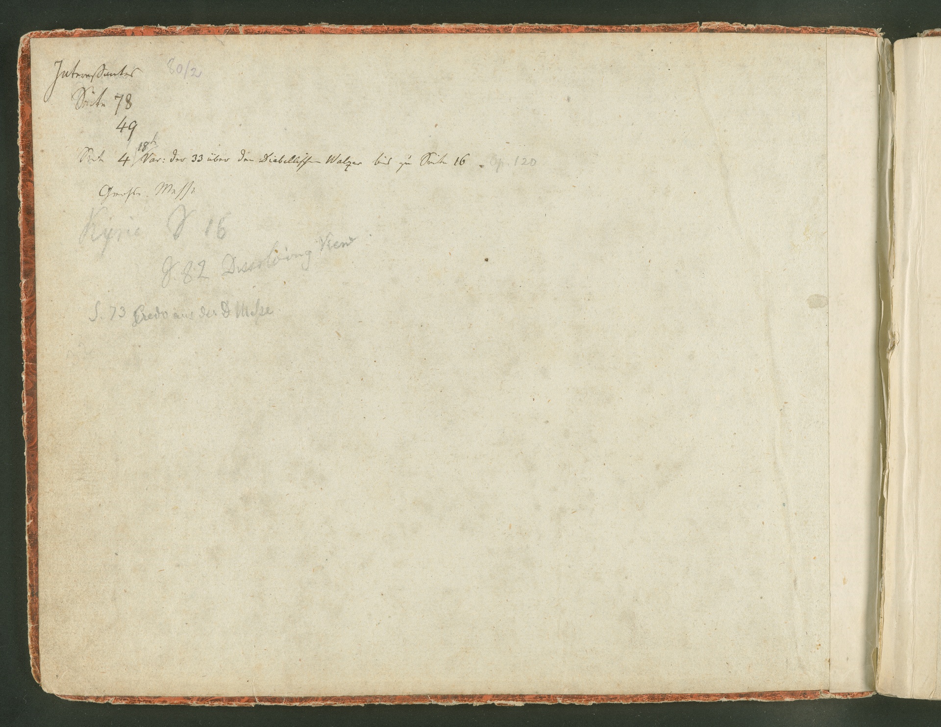 Die Überlieferungsgeschichte dieses Skizzenbuchs - des sogenannten Wittgenstein-Skizzenbuches - mit Entwürfen zu den Diabelli-Variationen und zur Missa solemnis lässt sich bis zur Versteigerung von Beethovens Nachlaß am 5. November 1827 zurückverfolgen. Damals ersteigerte es der Verleger C.A. Spina als Nr. 63 "Messe-Skizzen" und verkaufte es nur einen Monat später an den Autographensammler Aloys Fuchs weiter. Unter den Besitzern befanden sich klangvolle Namen wie Felix Mendelssohn Bartholdy und Ignaz Moscheles, die beide zu ihren Lebzeiten nicht nur gefeierte Virtuosen und Komponisten, sondern auch leidenschaftliche Autographensammler waren. Gerade Mendelssohn besaß etliche Beethoven-Autographe und erwarb häufiger Handschriften von Aloys Fuchs in Wien. Seinen heute geläufigen Namen erhielt dieses Skizzenbuch von Familie Wittgenstein in Wien, die es Anfang des 20. Jahrhunderts besaß. Namensgebungen dieser Art entbehren häufig der Logik - warum heute ausgerechnet der Name Wittgenstein mit dem Buch assoziiert wird, vermag niemand zu sagen. (J.R.)