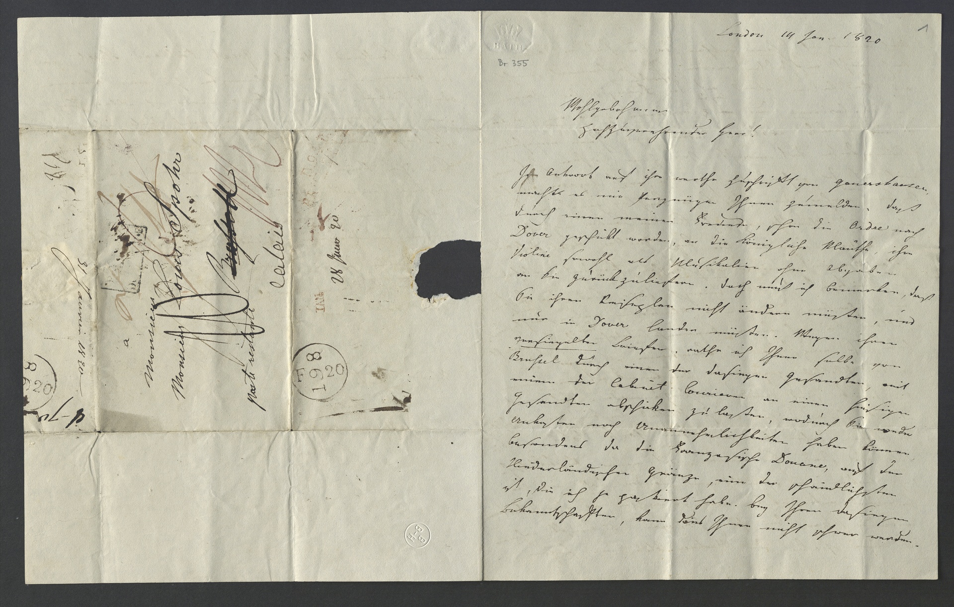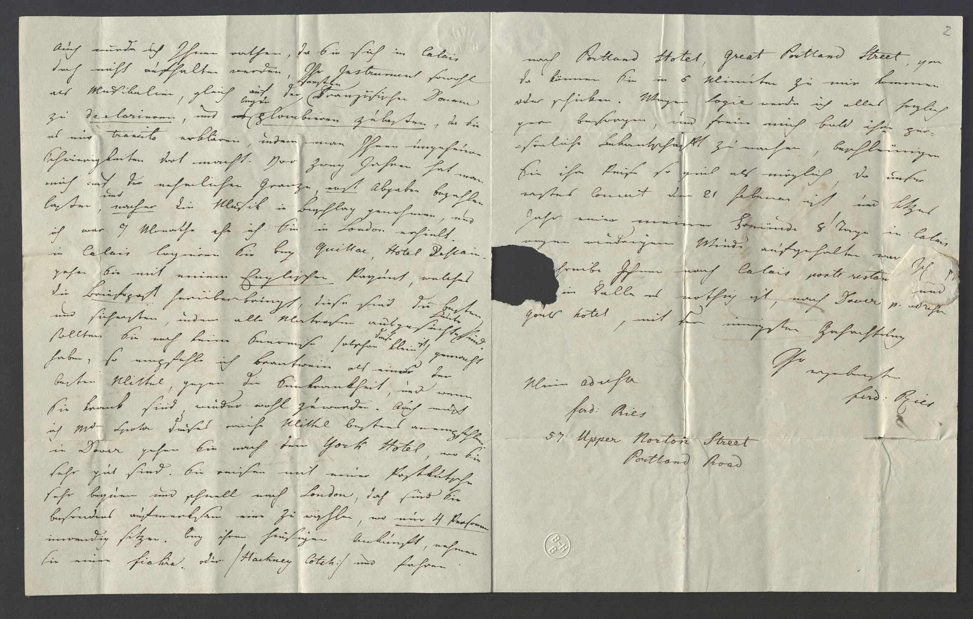 Ferdinand Ries, Brief an Louis Spohr in Brüssel, nachgeschickt nach Calais, London, 14. Januar 1820, Autograph