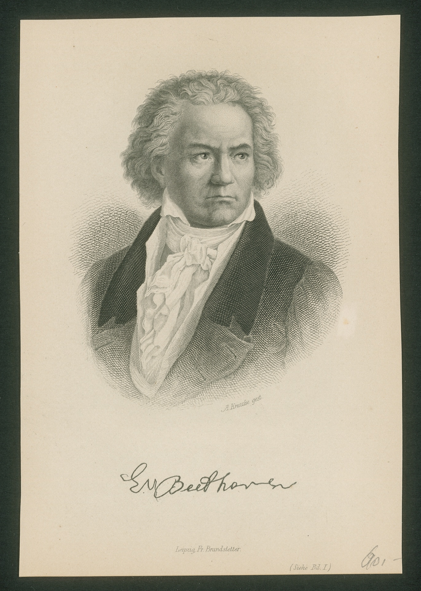 Ludwig van Beethoven - Stich von Alfred Krauße in Anlehnung an die Lithographie von Theodor Neu aus dem Jahr 1842 nach einer Zeichnung von August von Kloeber von 1822, erschienen bei Brandstetter, Leipzig, 1856