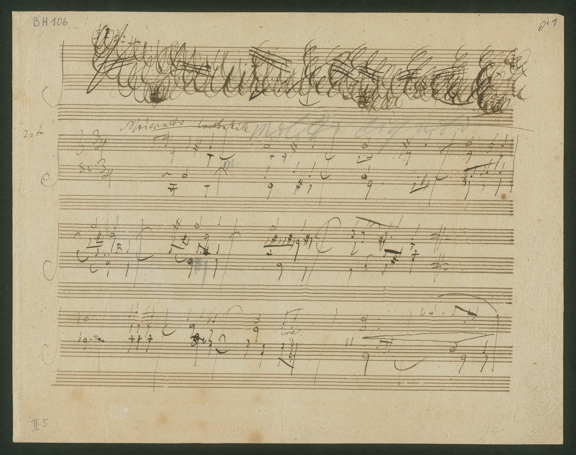 Beethovens Bagatellen op. 119 sind nicht, wie die späteren Bagatellen op. 126, eine Art Zyklus von Klavierstücken. Vielmehr setzte er sie aus mehreren Einzelteilen zusammen. Von den elf Nummern, aus denen op. 119 besteht, schrieb Beethoven die jetzigen Nr. 7-11 ursprünglich für den dritten Teil von Friedrich Starkes Wiener Piano-Forte Schule, der im Juni 1821 erschien. Folgerichtig trägt das Autograph die Überschrift: "Kleinigkeiten Für Hr v. Starke's Clavicembalum am 1=ten Jener 1821 von L. v. Bthwn." Die fünf Stücke waren im Autograph durchnummeriert, vor jede Bagatelle schrieb Beethoven ihre Ordnungszahl: die jetzige Nr. 7 war die "1=te", Nr.8 die "2=te" usw. Leider hat sich dieses Autograph nicht als ganzes Stück erhalten, sondern wurde in drei Teile zerteilt. Das vorliegende mittlere Stück gelangte 1926 ins Beethoven-Haus. Es enthält Nr. 8 vollständig und mit "2=te" bezeichnet, sowie die ersten neun Takte von Nr. 9, mit dem Vorsatz "3=te". Die "1=te" Bagatelle befindet sich in einer Privatsammlung, der zweite Teil von Nr. 9 sowie die Nummern 10 und 11 bzw. die "4=te" und "5=te" in der Bibliothèque Nationale de France in Paris. (J.R.)