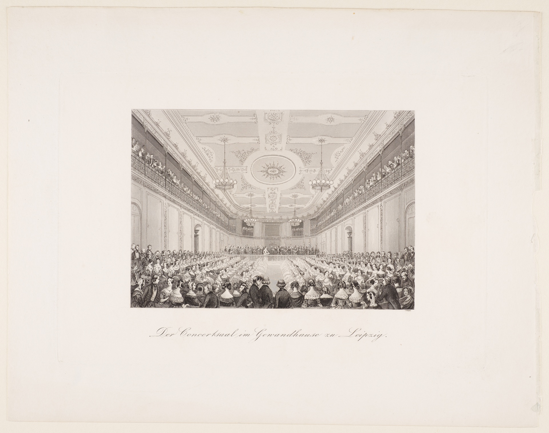 Innenansicht des gefüllten Konzertsaals im Leipziger Gewandhaus - Anonymer Stich, nach 1842