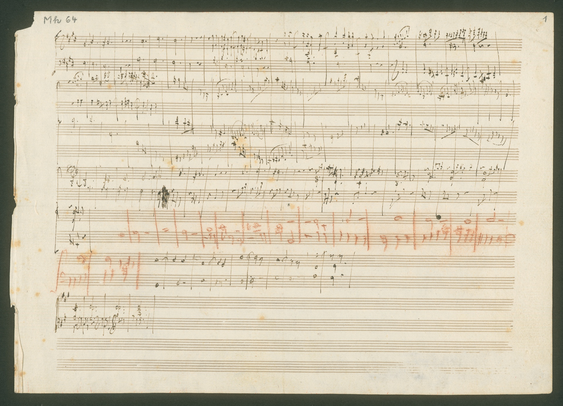 Beethoven komponierte seine sechs Streichquartette op. 18 zwischen 1798 und 1800 im Auftrag des Fürsten Franz Joseph Maximilian von Lobkowitz. Zu op. 18 ist eine Vielzahl von Skizzen überliefert, anhand derer wir die Genese der Quartette recht gut nachvollziehen können. Beethoven arbeitete an den Werken im Wesentlichen in drei Skizzenbüchern. Das erste davon liegt heute in der Staatsbibliothek zu Berlin Preußischer Kulturbesitz und trägt (nach dem Vorbesitzer) die Signatur Mus. ms. autogr. Beethoven Grasnick 1. "Grasnick 1" hatte ursprünglich 48 Blätter - eine Standardgröße zur Beethoven-Zeit. Die ersten neun Blätter wurden jedoch herausgetrennt, vermutlich schon bevor der Autographensammler Friedrich August Grasnick es Mitte des 19. Jahrhunderts erwarb. Die Spur der meisten dieser entfernten Blätter konnte jedoch nachvollzogen werden, ihre Mehrzahl ist mittlerweile identifiziert. Zwei davon sind die hier abgebildeten beiden Skizzenblätter mit Notaten zum dritten Quartett aus op. 18. Die beiden Blätter gehören nicht nur an den Anfang des Skizzenbuches "Grasnick 1", sie lagen dort auch direkt nacheinander. Dies beweisen uns zwei relativ kleine Tintenflecke, die beim Schreiben mit einer Feder oft vorkommen. Da die Tinte nicht so schnell trocknet, bilden sich Tropfen von einer Seite auf der gegenüberliegenden Seite ab. Auf der Rückseite von HCB Mh 64 (Bild 2), oberhalb des dritten Systems von unten, ungefähr nach dem ersten Längendrittel der Zeile, ist mitten im Notentext ein kleiner, verwischter Tropfen erkennbar. Der Abdruck dieses Tropfens findet sich auf dem anderen Skizzenblatt, HCB Mh 65 (dort Bild 1), hier auf der Vorderseite. Er ist hier viel deutlicher zu erkennen, denn an dieser Stelle ist das Notensystem leer. Dieser einfache kleine, kaum auffallende Abdruck belegt, dass beide Blätter nacheinander in dem gleichen Buch gebunden waren. Aus der Forschung wissen wir, dass Beethoven seine Arbeit zu den Streichquartetten op. 18 im Skizzenbuch "Grasnick 1" 1798 begann. Die Tatsache, dass auf den ersten Blättern des Buches, zu denen auch die hier vorliegenden gehören, Skizzen zum dritten Quartett notiert sind, offenbart eine weitere Tatsache der Entstehungsgeschichte: Die Reihenfolge der sechs Quartette op. 18, wie wir sie heute kennen, entspricht nicht der Reihenfolge ihrer Entstehung. Ganz offensichtlich begann Beethoven die Arbeit mit dem Quartett Nr. 3. (J.R.)