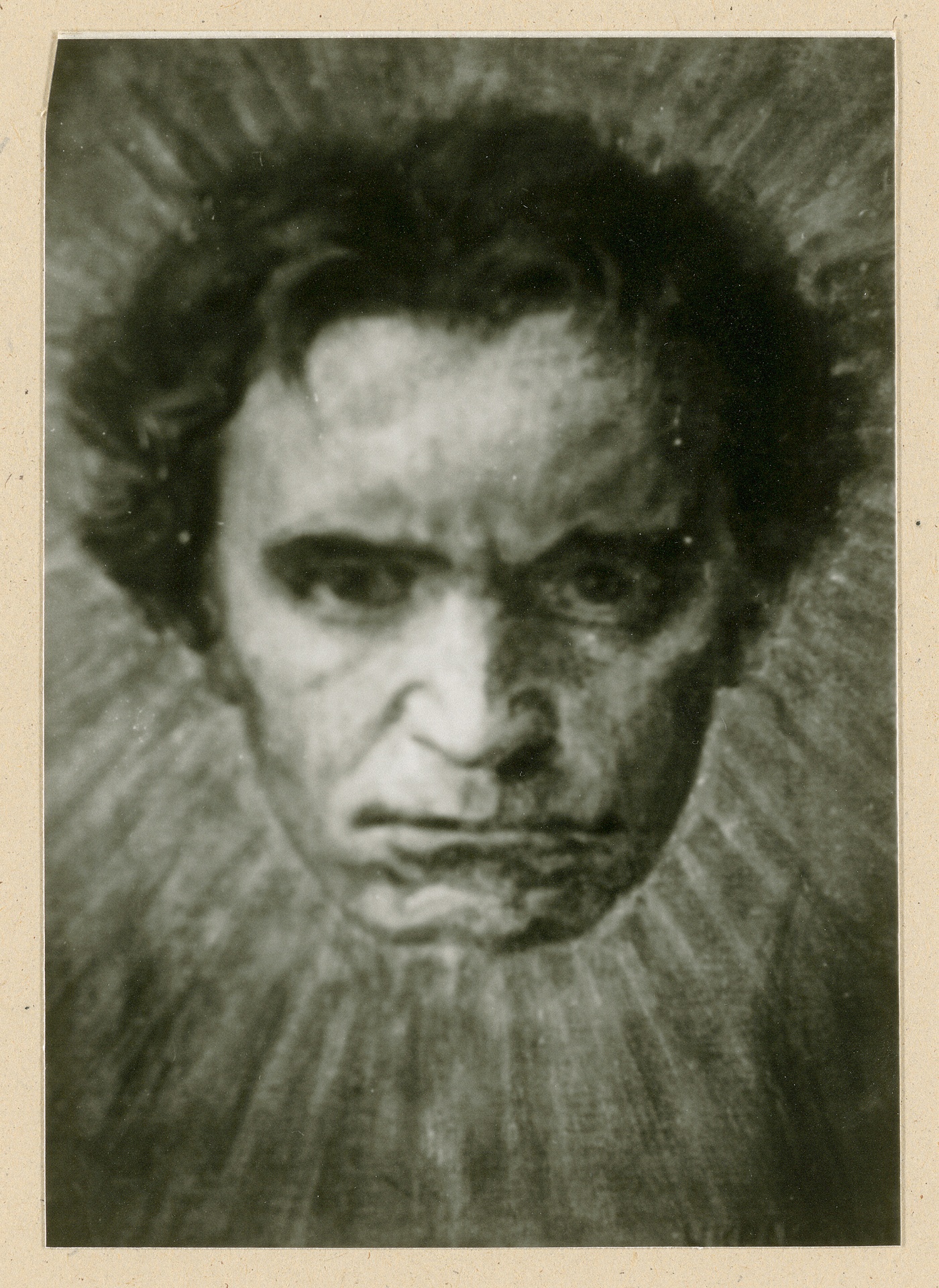 Ludwig van Beethoven, Kopf in Strahlenkranz - Fotografie, vermutlich von Luitgard Hartmann, nach einem Gemälde von Herrmann Krahforst