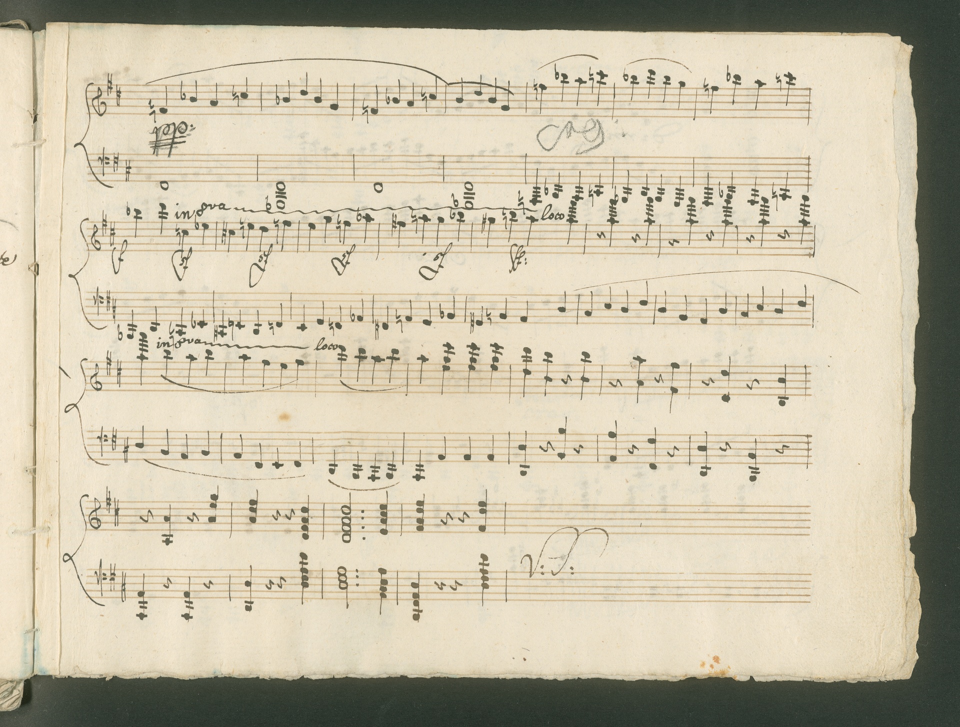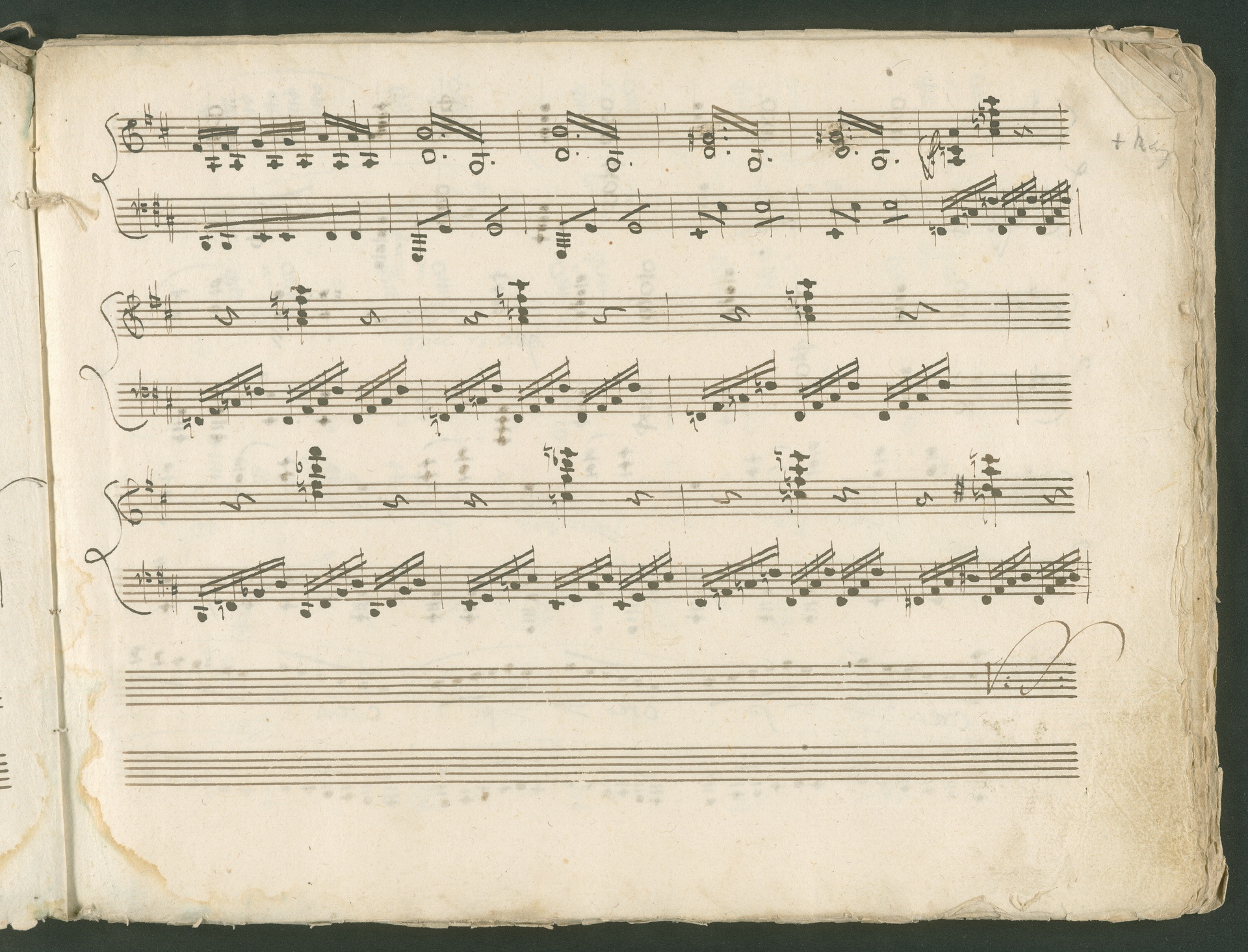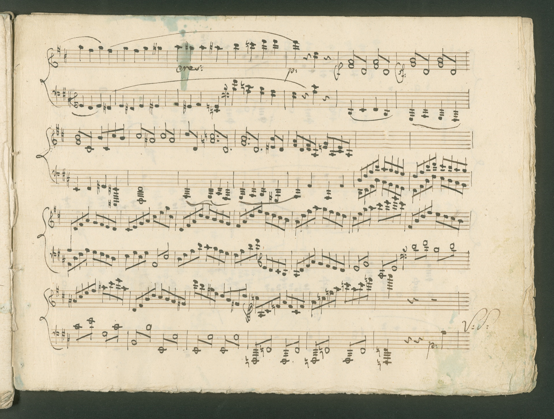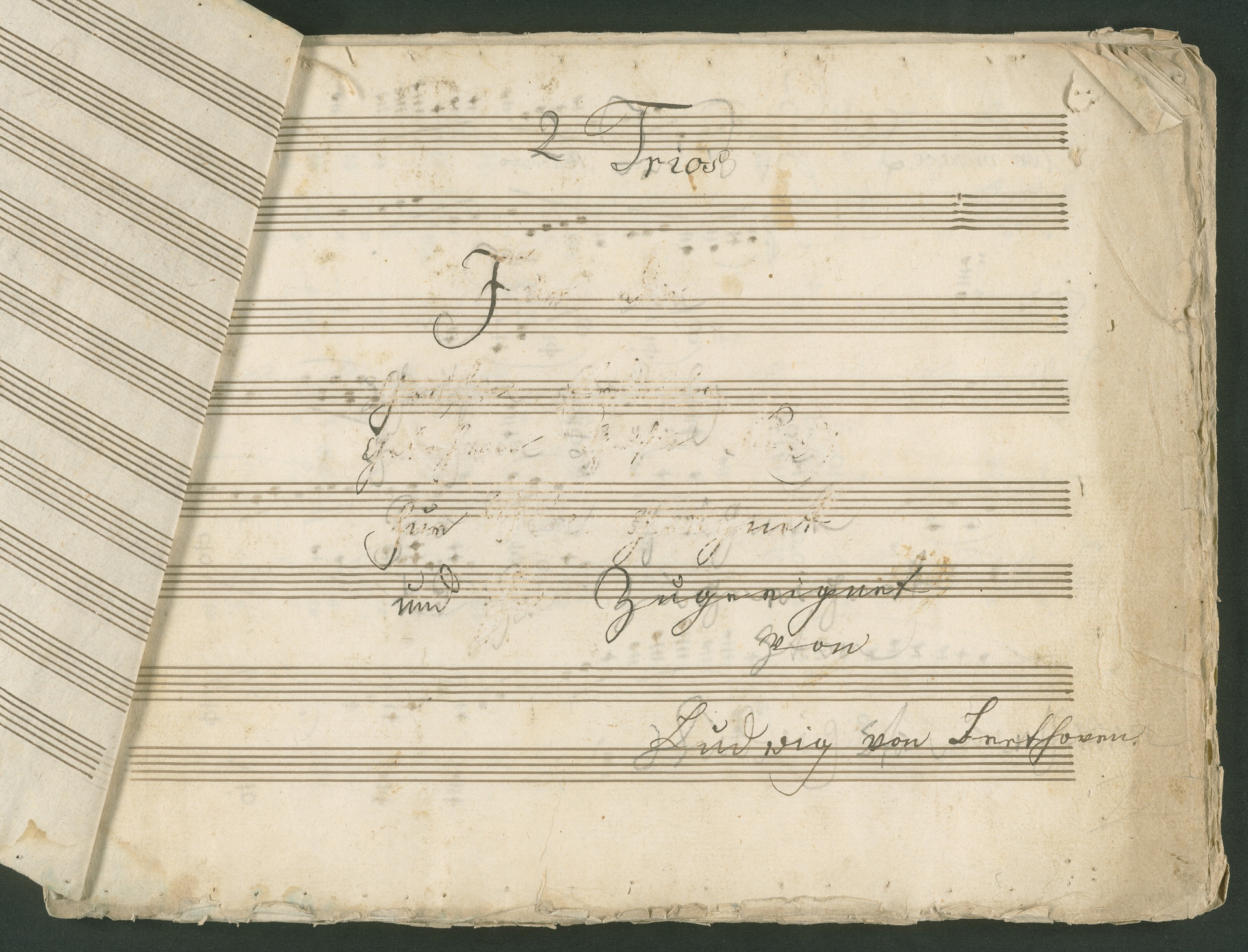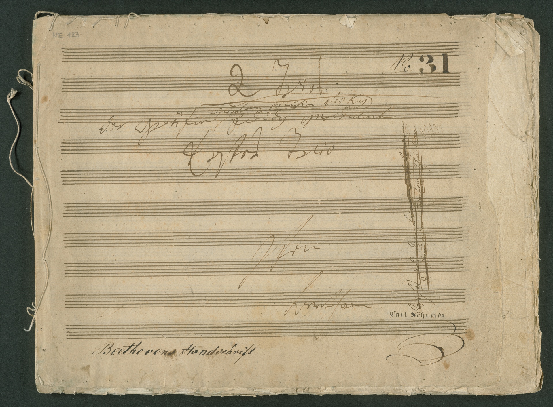 Die Abschrift hat zwei Titelblätter. Nachdem die erste Fassung (jetzt Bl. 2) mehrfach korrigiert und durch Rasuren nahezu unleserlich geworden ist, entschloss sich Beethoven offensichtlich zu einer "ordentlichen" Version, also zu einem zweiten Titelblatt (jetzt Bl. 1). Dieses zweite Blatt - aus einer anderen Papiersorte - wurde auf den ursprünglichen Titel aufgenäht (die Naht ist mittlerweile weitgehend geöffnet). Neben Titel, Widmung (an die Gräfin Erdödy) und Unterschrift ist darauf rechts quer und durchgestrichen eine weitere Bemerkung von Beethovens Hand verzeichnet: "Dieses wird die Baronin Ertmann den kommenden Dinstag spielen". Freifrau Dorothea von Ertmann war eine begabte und virtuose Pianistin, die Beethoven nicht nur als Interpretin sehr schätzte - er widmete ihr auch die Klaviersonate op. 101. Möglicherweise spricht Beethoven von der vorliegenden Abschrift, als er seinen Freund Nikolaus Zmeskall am 16. April 1809 brieflich bittet: "Wenn ich nicht komme lieber Z, welches leicht geschehen kann, bitten sie die Baronin Ertmann daß sie ihnen die Klawierstimme von dem Terzett da läßt, und haben sie hernach die Gefälligkeit mir solche mit den übrigen Stimmen noch heute zu schicken" (BGA 377, Beethoven an Nikolaus Zmeskall [Wien, 16. April 1809]). Die überprüfte Abschrift trägt zahlreiche dynamische Vorschriften, teilweise ausführlicher als das Autograph oder die Originalausgabe. Zudem enthält sie auf Bl. 7r (Bild 13) eigenhändige Fingersätze Beethovens. Hat die Freifrau Ertmann aus dieser Stimme musiziert, von Beethoven für sie eingerichtet? (J.R.)